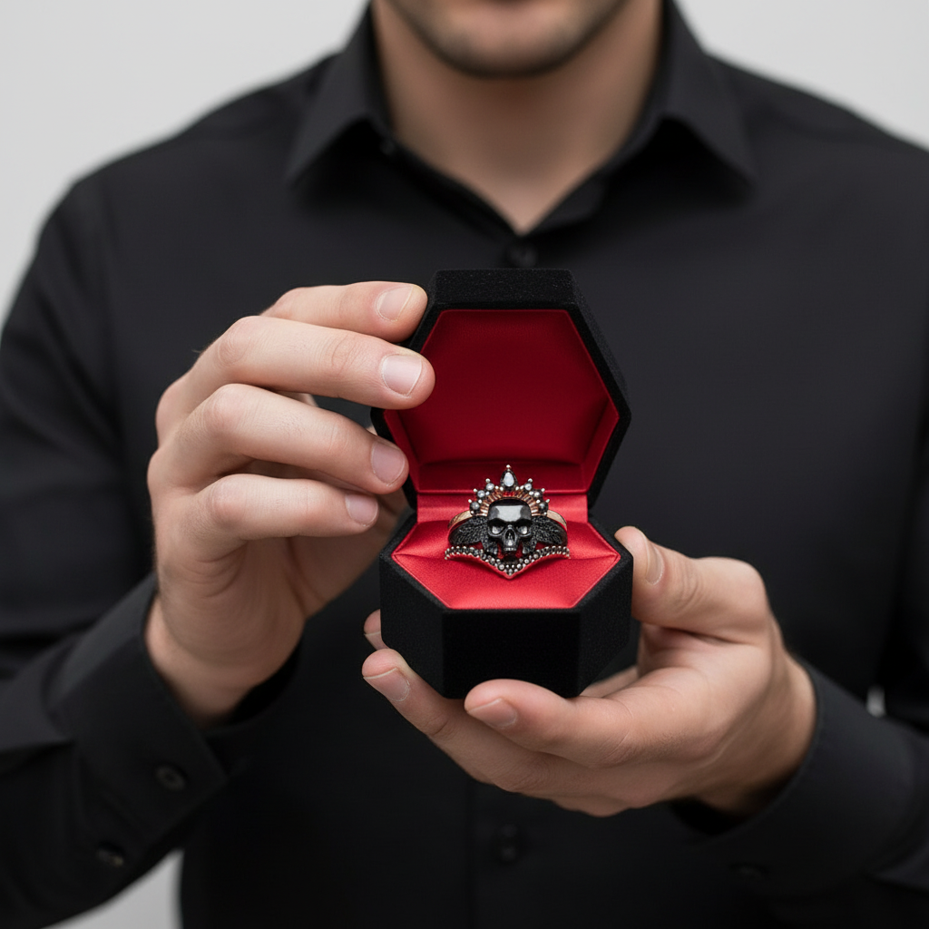 Rule with passion and power wearing the My Queen Gothic Skull Ring Set, a striking blend of love and rebellion. Handcrafted for gothic brides and alternative couples, this unique engagement and wedding ring set symbolizes loyalty, strength, and individuality. Perfect for those who crave punk elegance and dark romance, this skull bridal jewelry makes a bold proposal ring gift that celebrates a love like no other.