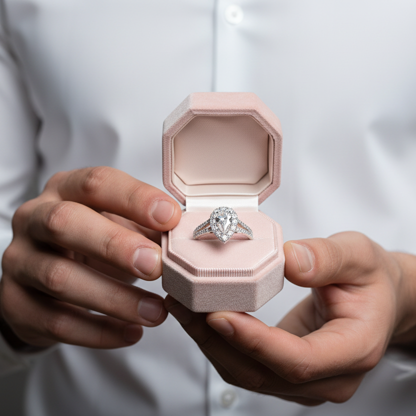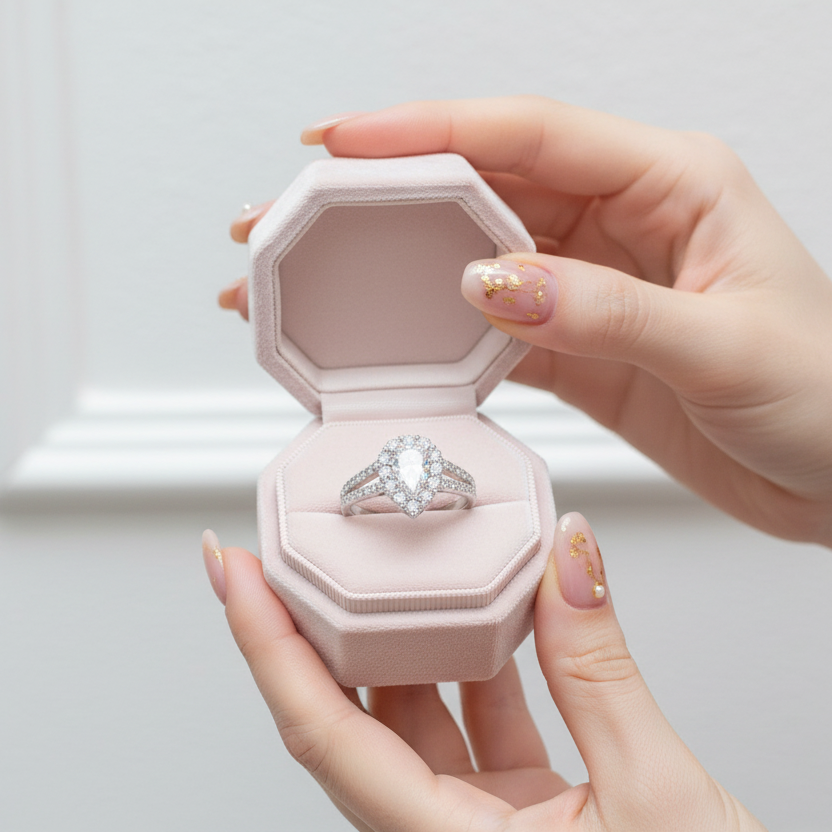 A stunning pear-cut moissanite engagement ring that sparkles with exceptional brilliance. This 1.74 carat centerpiece is set in 925 silver with five layers of 18k white gold plating for lasting durability and elegance. Perfect for those seeking a beautiful, affordable alternative to traditional diamonds.