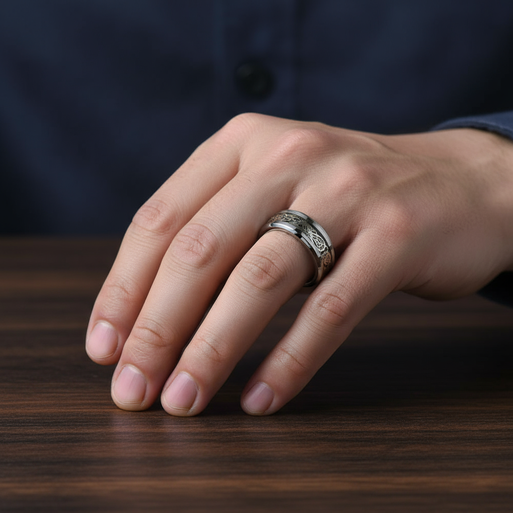 This Dragon Inlay Men's Tungsten Carbide Wedding Band is crafted from durable, ethically sourced materials for lasting wear. It offers a unique and affordable alternative to traditional wedding bands.
