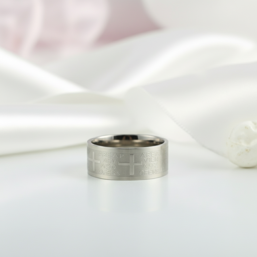 A timeless stainless steel wedding band featuring a meaningful Bible quote. Perfect for engagements, anniversaries, or any special occasion.