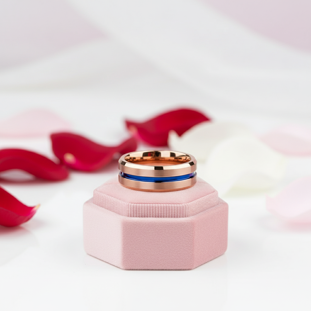 This 8mm men's tungsten carbide wedding band in rose gold, highlighted by a vibrant blue line, is meticulously handcrafted to deliver stunning brilliance and sparkle like a diamond. It’s designed for you, your loved ones, and the one who cherishes you.