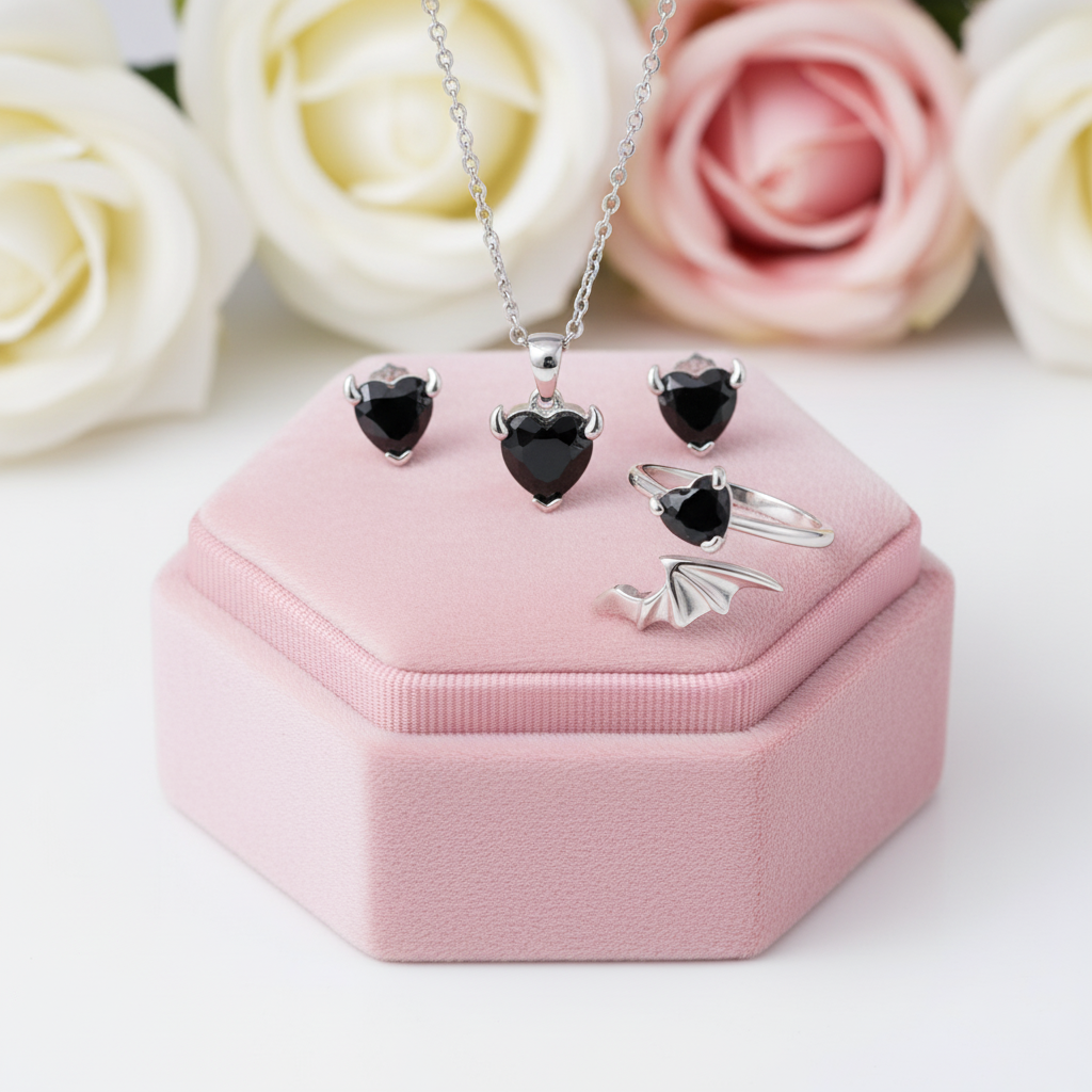 Discover the Cool Black Devil Heart Diamond Jewelry Set, crafted from 925 silver with 18k gold plating for lasting shine. Featuring a devil heart pendant and matching earrings with sparkling Diamond Alternative accents, this set adds elegant sparkle to any outfit. Enjoy luxurious style at an accessible price.