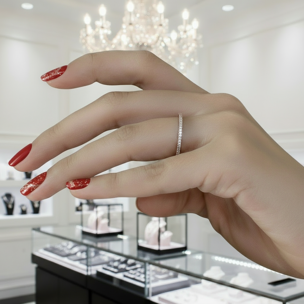 Crafted in rose gold with diamonds meticulously set by hand, this full eternity band epitomizes refined elegance. Its slender silhouette complements any engagement ring while standing beautifully alone. A versatile choice for weddings, anniversaries, or meaningful milestones, this sophisticated piece transcends occasion—equally suited for personal indulgence or as a treasured gift for those who appreciate timeless luxury.