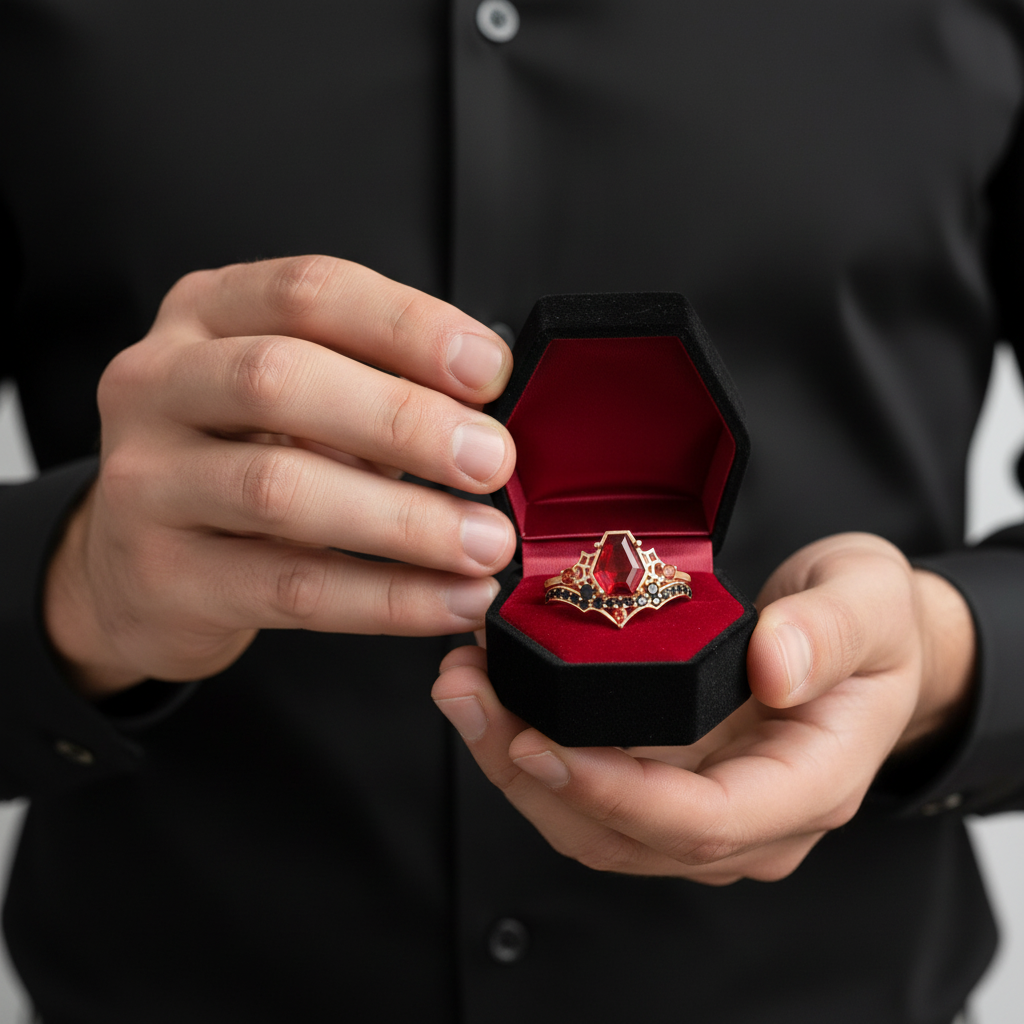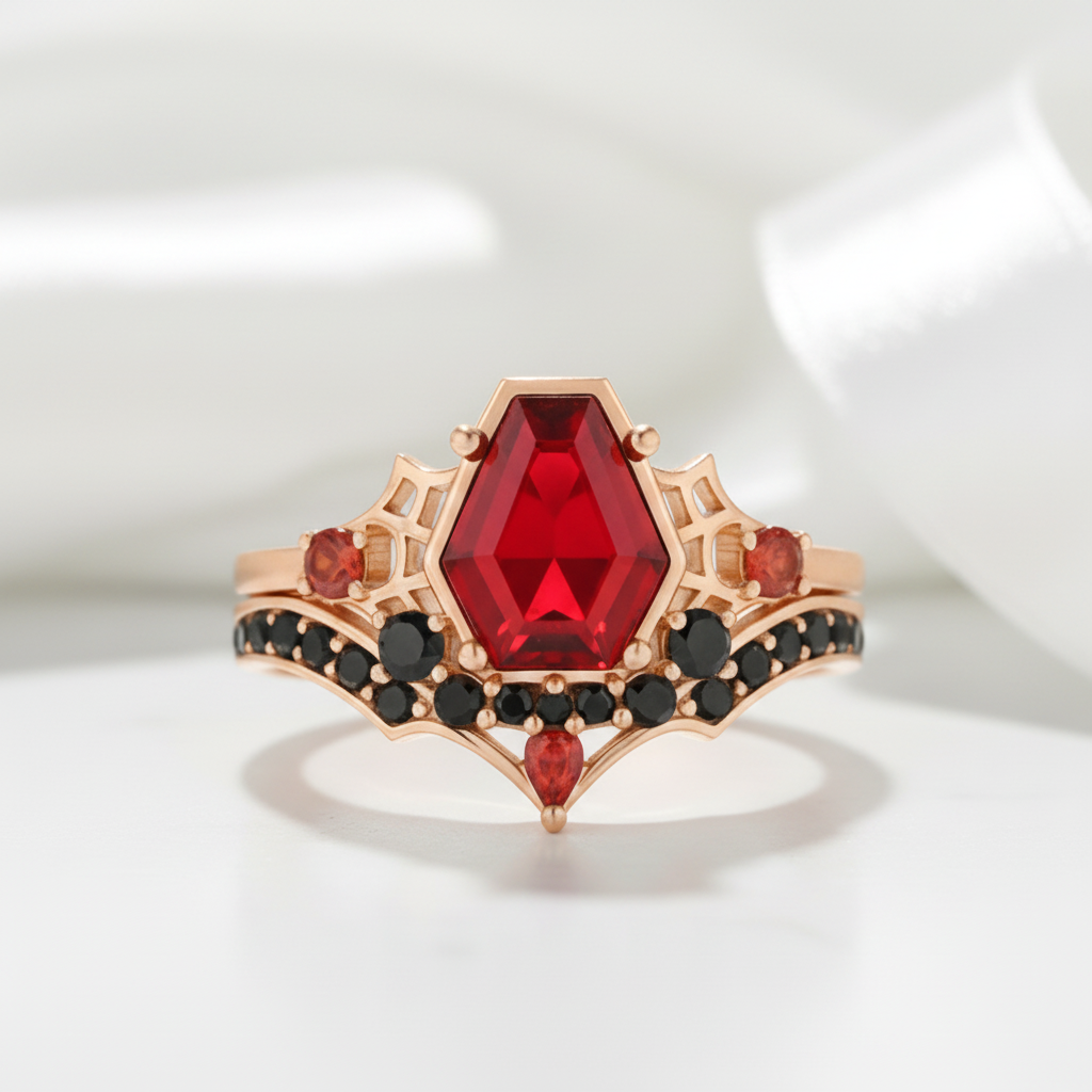 Seal your love in eternity with the Eternal Vows Ring Set, featuring a mesmerizing spider web design and coffin-cut gemstone centerpiece. Perfect for gothic brides and alternative couples, these black wedding rings symbolize strength, devotion, and dark romance. Handcrafted for those who crave elegance with an edge, this gothic engagement and wedding ring set is the ultimate expression of eternal love.