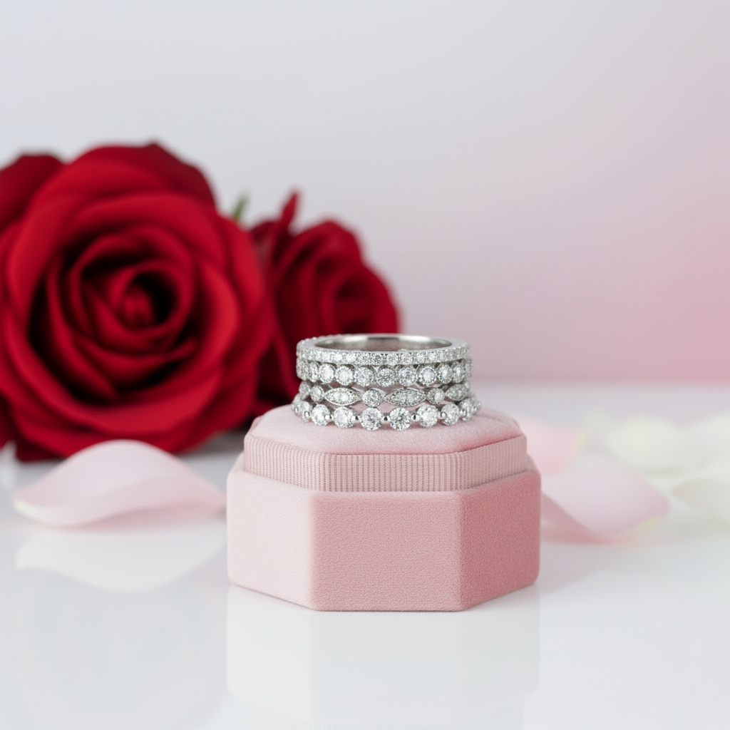Experience true luxury with our Full Eternity 4PC Stackable Ring Band Set, crafted from premium sterling silver with a sleek white gold plating. Adorned with sparkling simulated diamond accents totaling 2.0 carats, these rings are truly a statement of refined elegance. Their clear stone color will add a touch of sophistication to any outfit.