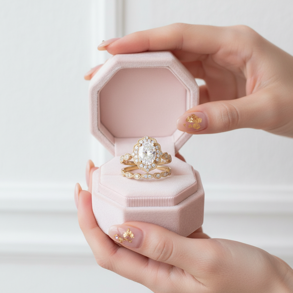 Handcrafted in yellow gold, this Art Deco wedding set features an elegant oval-cut diamond surrounded by a sparkling halo and delicate milgrain detailing. The timeless design works beautifully as an engagement ring, wedding band, or anniversary piece. Whether celebrating a milestone moment or marking a special occasion, this set captures sophistication and romance in every detail.