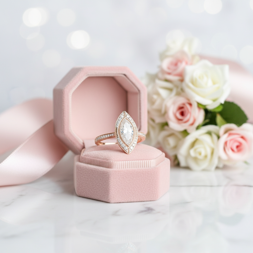 This stunning 14k Rose Gold Marquise Cut Vintage Certified Moissanite Engagement Ring is a gorgeous choice for the soon-to-be-betrothed. Crafted to the highest quality with an intricate halo of shimmering Certified Moissanite. This ring will be an eye-catching reminder of your love. Beyond the undeniable sparkle and luxurious feel, this magnificent ring is also affordable, so you don't have to break the bank! This gorgeous piece is crafted to last and is sure to become a treasured family heirloom for generations to come. Make them yours today, and let everyone know of your love.