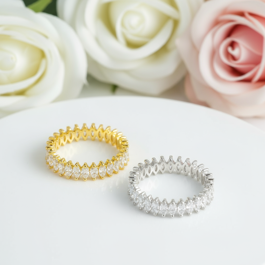 Create a lasting impression with the 3.0 Ctw Marquise Cut Certified Moissanite Wedding Band by Black Diamonds New York. This beautiful band features a breathtaking 3 carat total of marquise cut moissanite stones, set in lustrous 925 silver dipped 5x in 18k gold. Its stunning design, high quality craftsmanship, and affordable price make it a must-have for any bride-to-be. Shine bright with this sparkly and elegant ring on your finger.