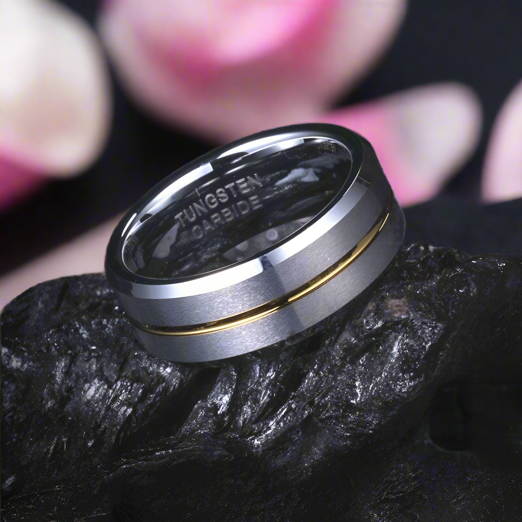 This 8mm tungsten wedding band features a refined gold stripe, meticulously crafted to endure a lifetime. It combines exceptional quality with ethically sourced materials for a timeless symbol of commitment.