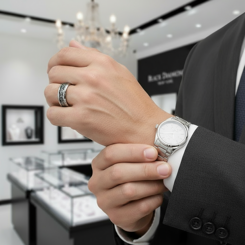 TITANIUM: Exceptionally durable, titanium provides a lighter-weight and hypoallergenic option. Can come in various finishes, including polished, brushed, or coated. While the metal itself is durable, certain finishes, such as coatings, might wear off over time with heavy use. Also note that while titanium is scratch-resistant, it's important to remember that no metal is completely scratch-proof.