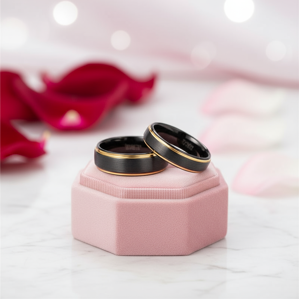 This men's wedding band features durable black tungsten with elegant gold edges. Crafted from high-quality, ethically sourced materials, it offers lasting style without the high price.