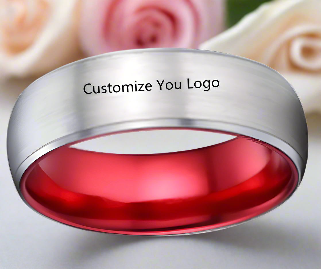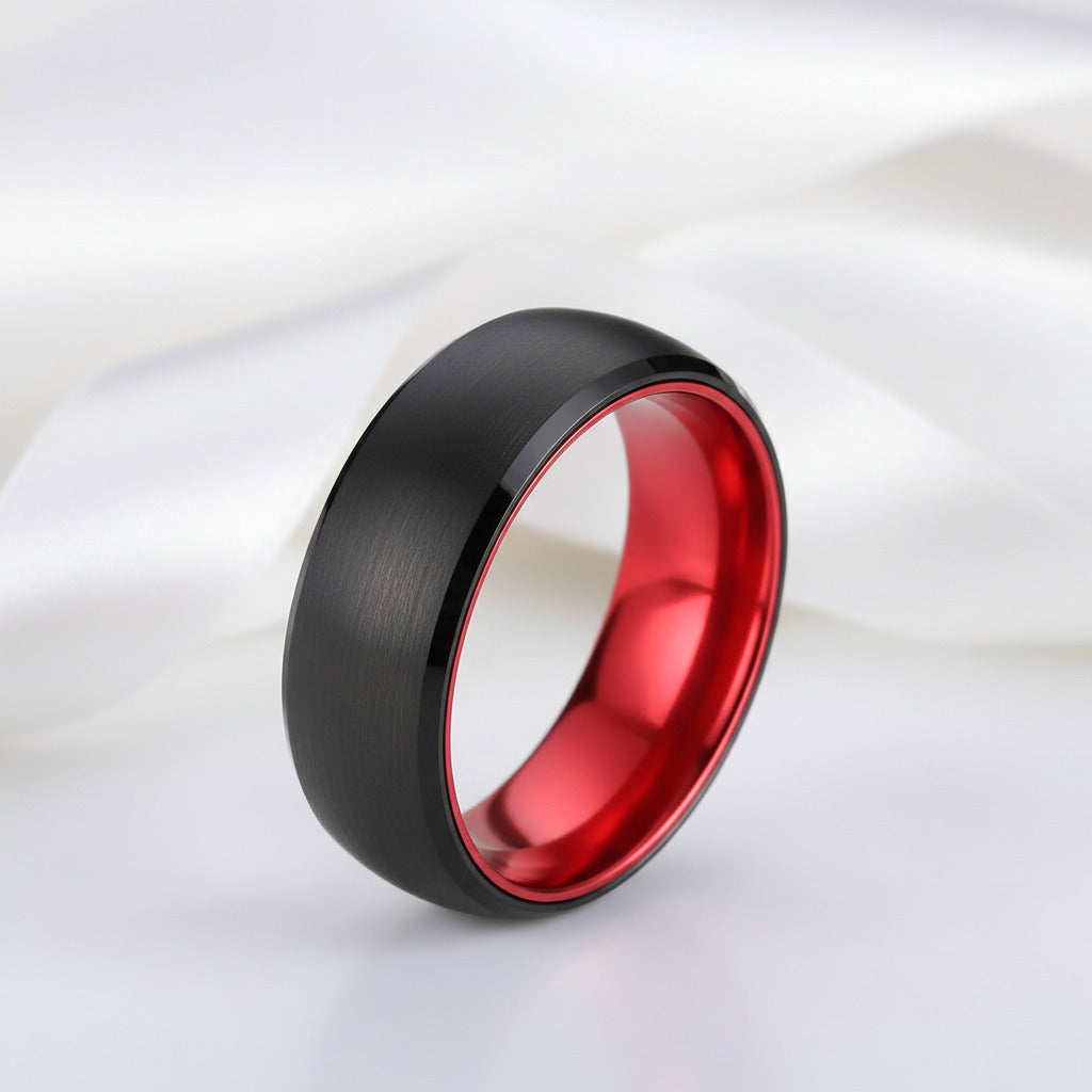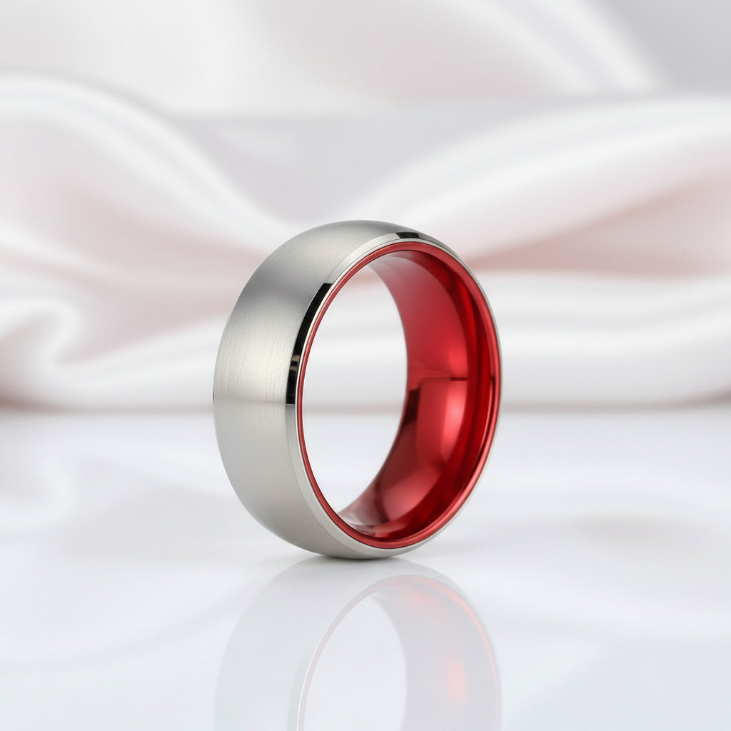 This 8mm solid red brushed dome tungsten carbide men's wedding band is expertly crafted for enduring elegance and lifelong durability.