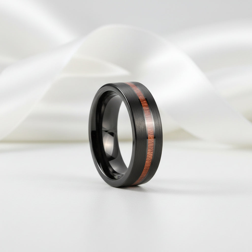 This Black Tungsten Carbide Wedding Band features a 6mm wide matte black plated surface with a tension mount design. It is elegantly inlaid with natural KOA wood, combining durable tungsten metal with the organic beauty of wood for a refined and distinctive look.