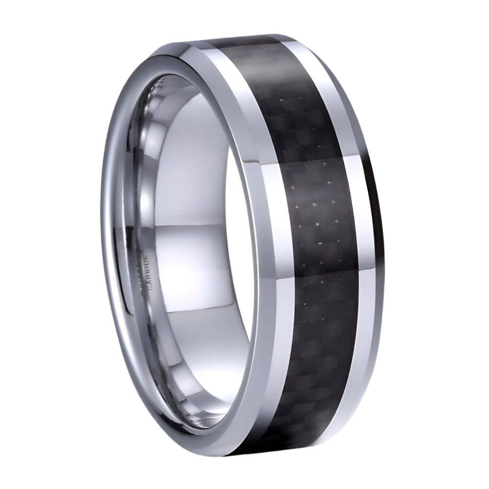 This classic wedding band combines the strength of tungsten carbide with a striking black carbon fiber inlay, expertly handcrafted for enduring wear. Featuring an 8mm white surface and a comfortable inner fit, it offers both lasting durability and timeless elegance.