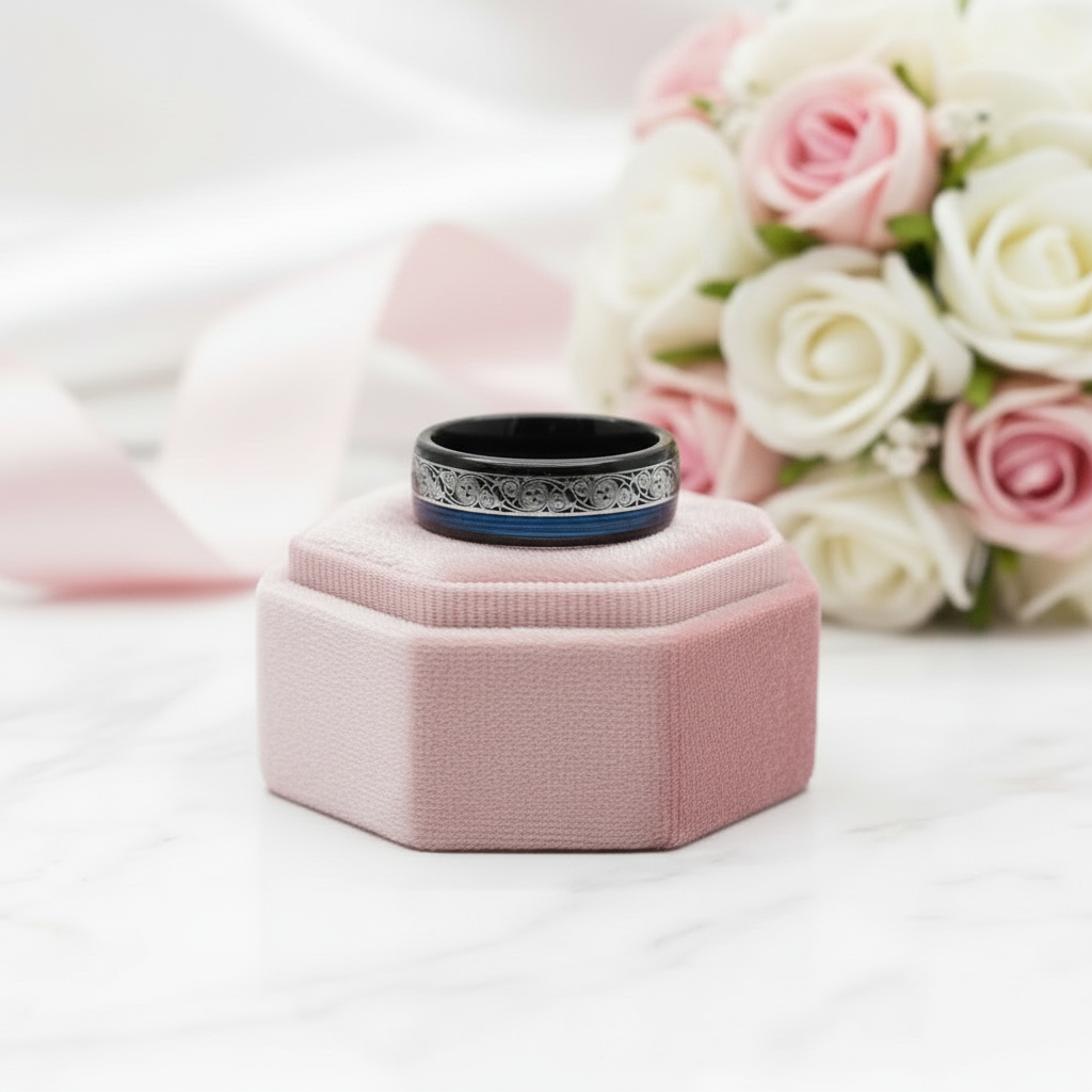 Discover style and durability with our 8mm Black Tungsten Ring featuring a spiral pattern and blue guitar string inlay. This unique design adds a bold touch to any look, crafted to last and impress. Perfect for everyday wear or special moments, it offers sophistication without the high price.