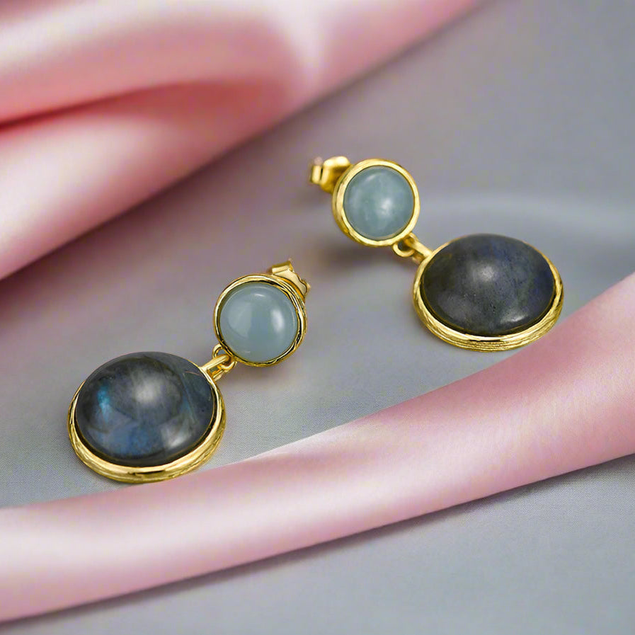 Elevate your elegance with the Mysterious Lake Round Dangle Earrings. Crafted from 925 sterling silver and finished with yellow gold plating, these earrings feature a captivating labradorite as the centerpiece, complemented by delicate moonstone accents.