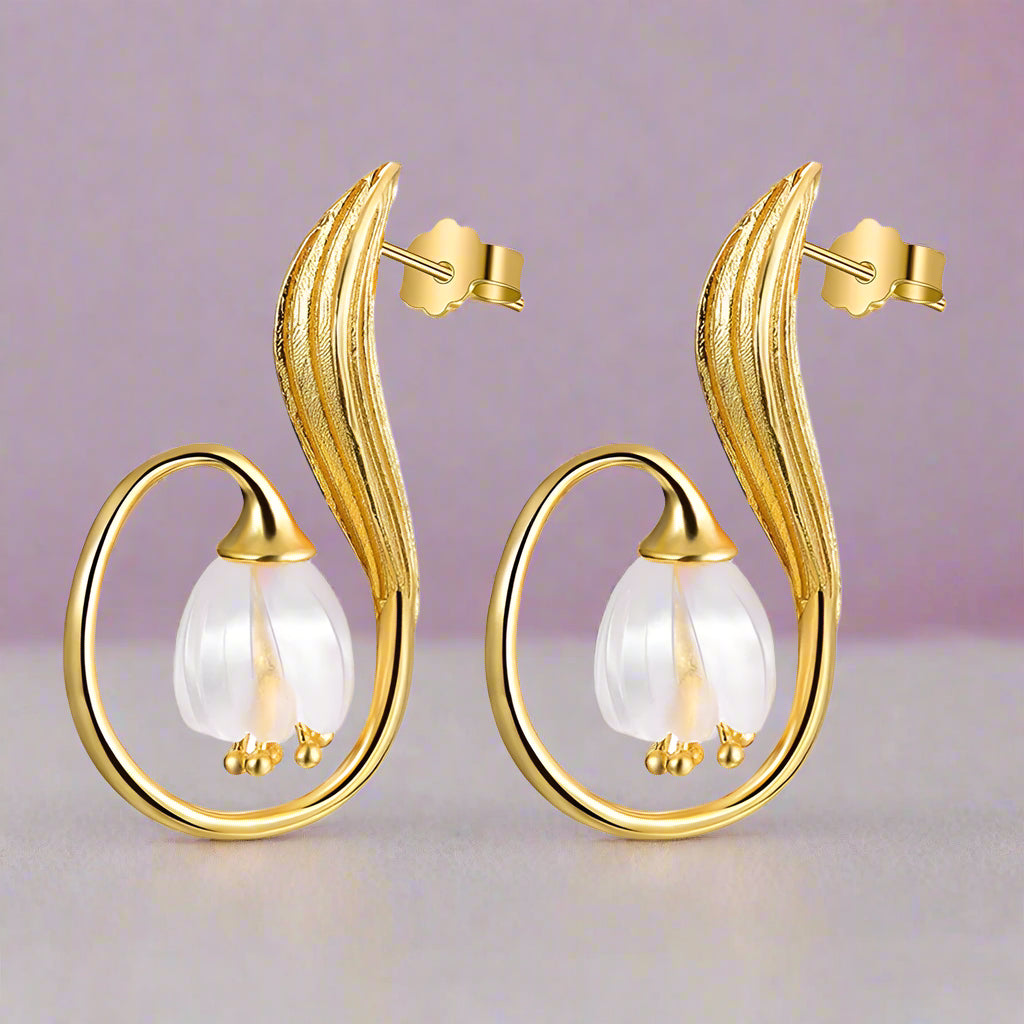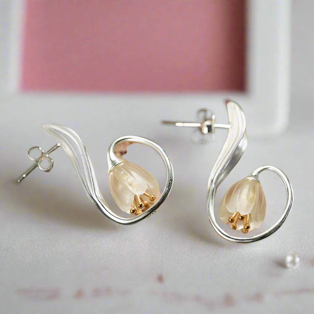 Embrace your adventurous spirit and stand out from the crowd with these striking Crystal Lily of the Valley Flower Dangle Earrings. Each pair is meticulously crafted with natural gemstones, flowers, and leaves to complement your unique style. Refuse to settle for the ordinary and choose 100% unique designs made with the highest quality materials. Dare to be bold and express your individuality with these sustainable and stunning earrings!