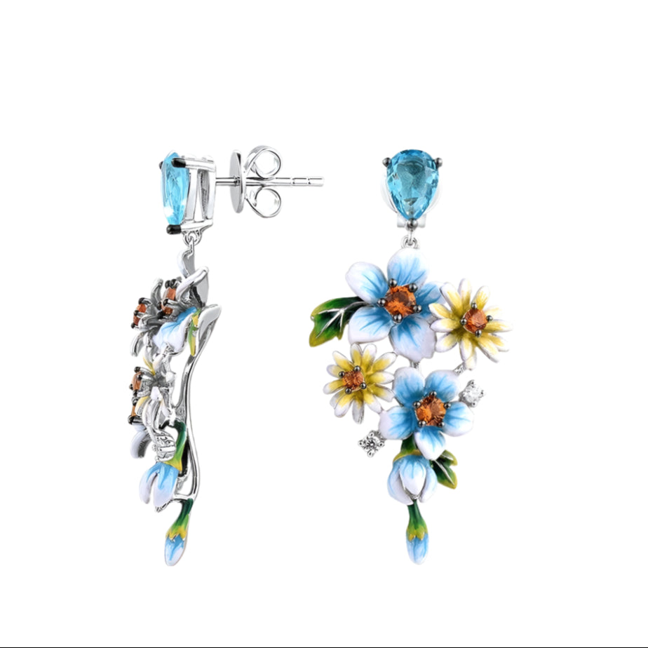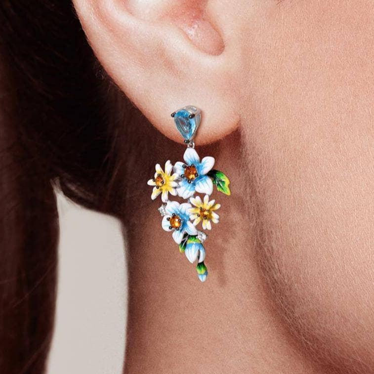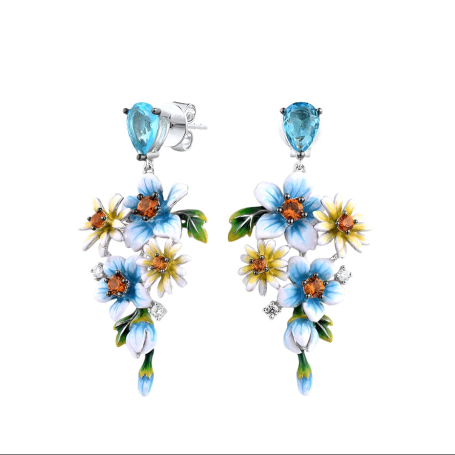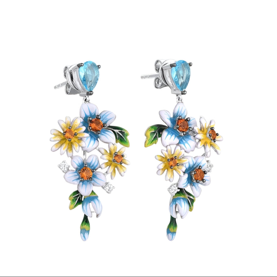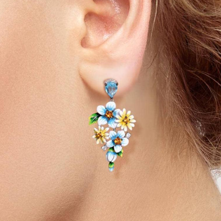 Delicate blue and yellow enamel flower earrings accented with diamonds, inspired by nature’s beauty and crafted with flowers, leaves, and natural gemstones. Each pair is carefully handmade to reflect your unique style, ensuring they stand out from common designs. Made entirely from the finest materials and authentic stones, these earrings offer exceptional quality, sustainability, and individuality. Don’t settle—choose elegance that truly represents you.