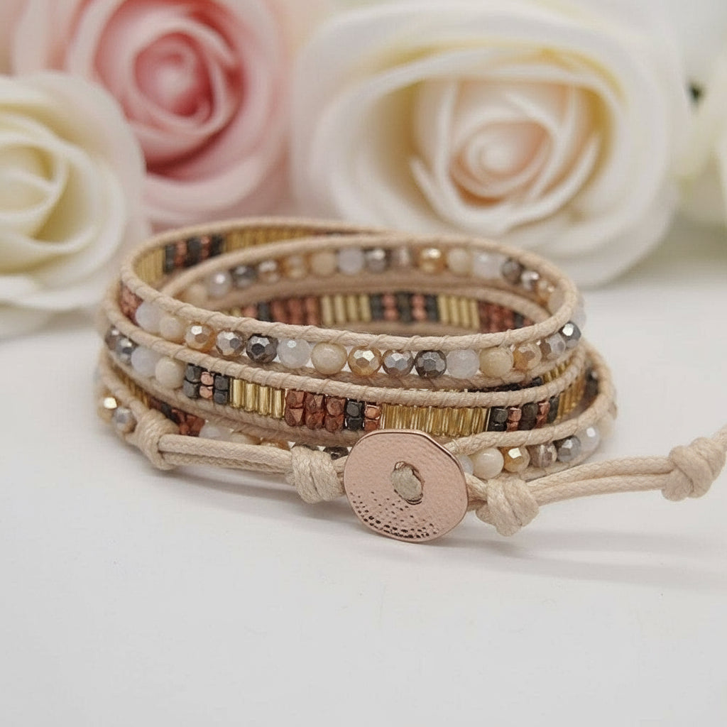 Crafted with an eclectic blend of materials, this bracelet combines polished agate with shimmering crystal and glass beads for understated elegance. The design features nugget brass accents, lava stone details, and delicate Japanese seed beads strung on a nickel-free plated chain. A secure button closure ensures comfortable everyday wear. Perfect for layering or wearing solo, this piece brings natural texture and subtle sparkle to any wrist.