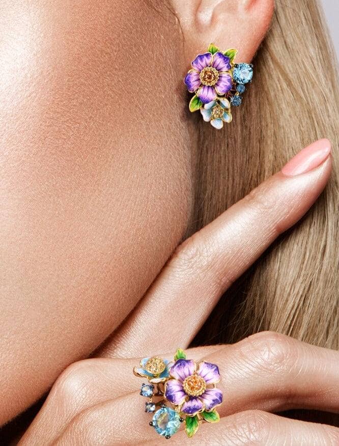 Elegant Purple Enamel Flower with Diamond Jewelry Set