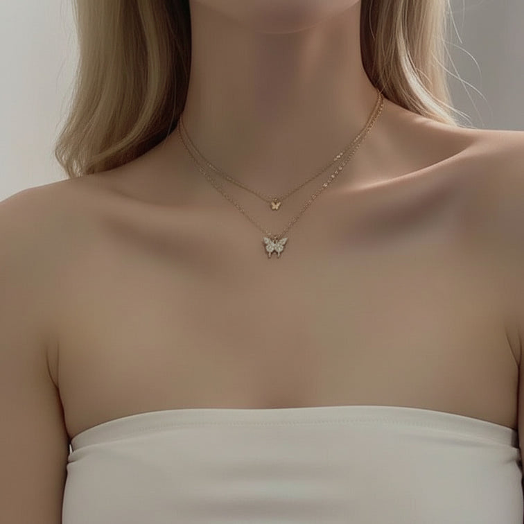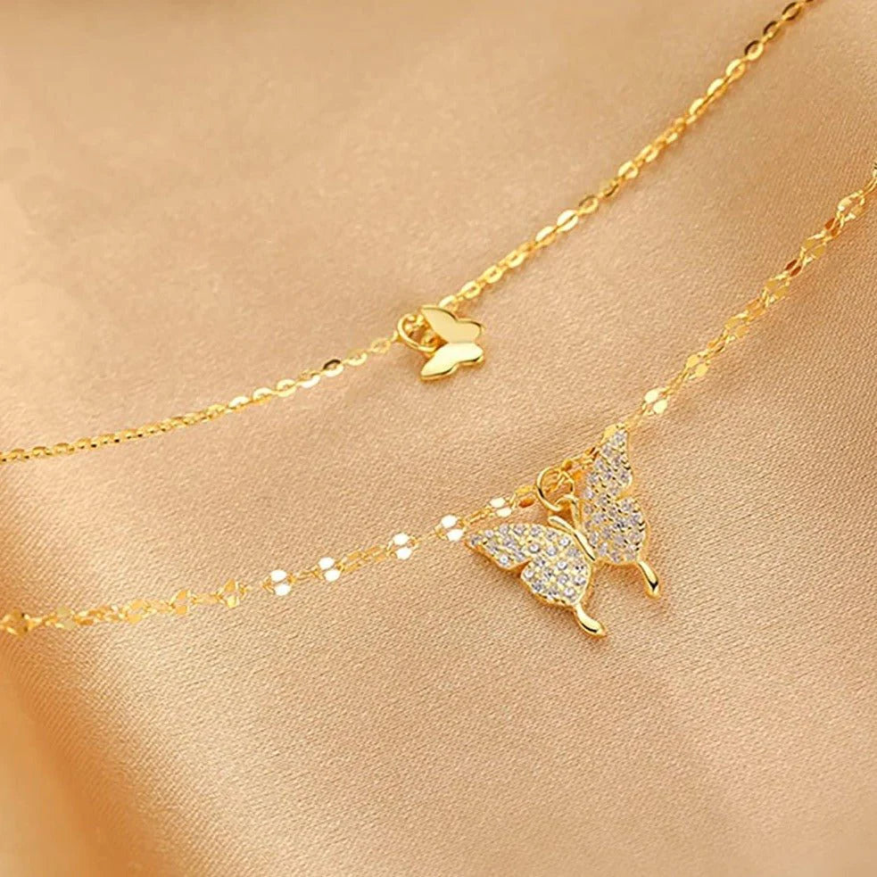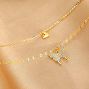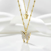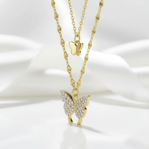 Delicately crafted from 925 silver dipped 5x in a vibrant 18k yellow gold. This double layered butterfly pendant necklace showcases the perfect combination of quality and style. A must-have for any fashion enthusiast, this necklace is the perfect accessory to add a touch of beauty and femininity to any outfit.