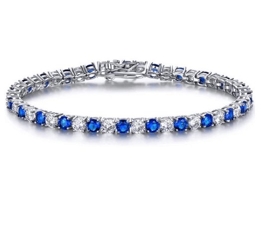 This elegant bracelet features a round cut design in sterling silver, accented by white and blue simulated diamond stones. Made with 925 sterling silver and plated with white gold, this piece is both stunning and durable. The white and blue sapphire stones add a touch of sophistication to the overall look.