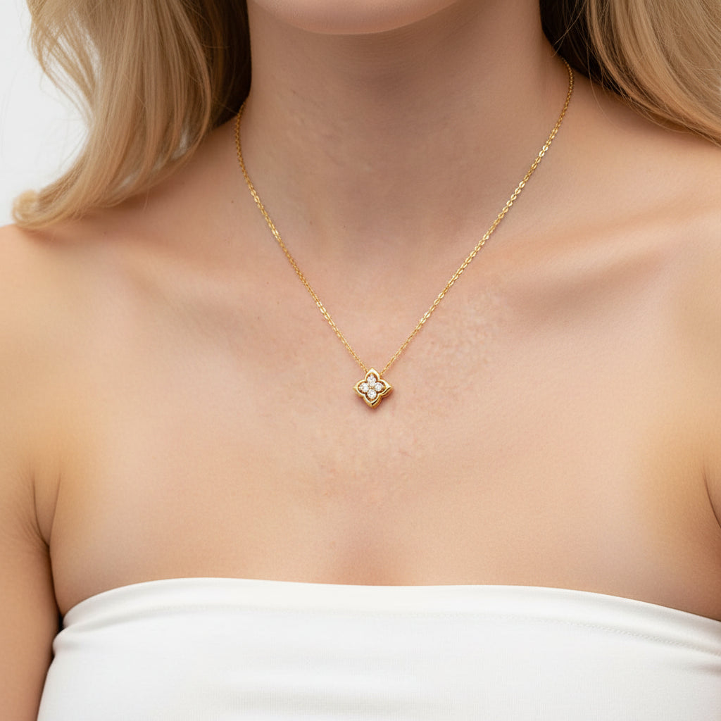 Four-leaf clover pendant crafted with brilliant moissanite stones and finished in 18k gold overlay. A timeless symbol of luck and fortune, this necklace combines elegant design with the sparkle of lab-created diamonds. Perfect for everyday wear or as a meaningful gift.