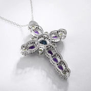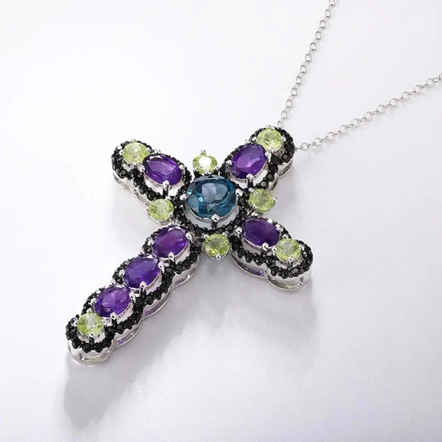 Dive into the unknown with our Mystical Multi-gems Cross Pendant Necklace by Black Diamonds New York. This adventurous piece, crafted from 925 Sterling Silver, features a mesmerizing array of London Blue Topaz, Amethyst, Black Spinel, and Peridot, totaling 7 carats in weight. Its mystical vibe, stunning sparkle, and unique design make it a must-have accessory for the bold and daring. Step up your fashion game with this high-quality and affordable necklace that exudes both style and mystery.