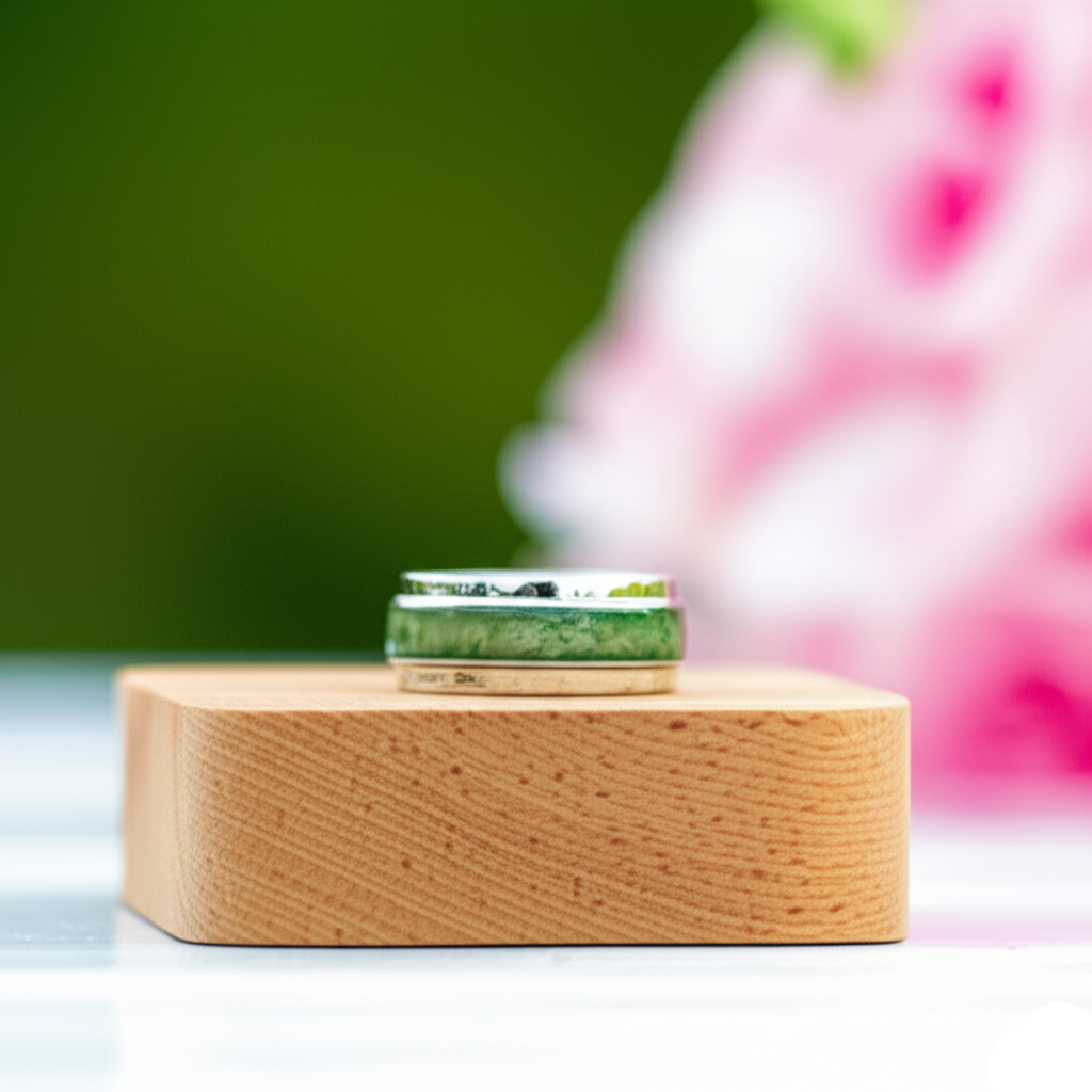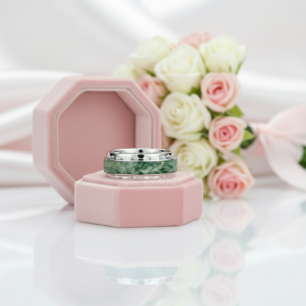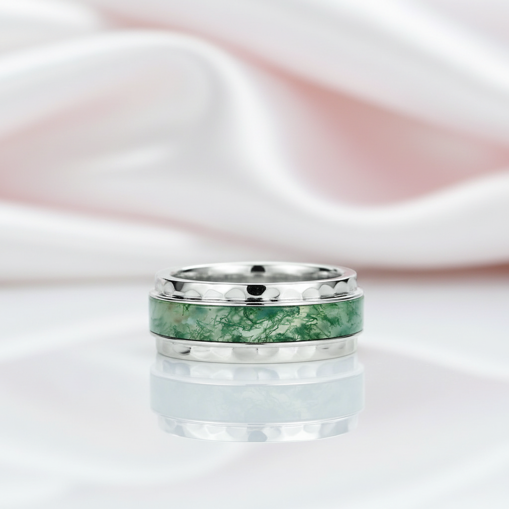 Experience the beauty and strength of our Natural Moss Agate Wedding Band, handcrafted from 925 sterling silver. The agate main stone is expertly set in a channel setting, creating a timeless piece that is perfect for any wedding band.