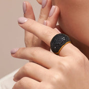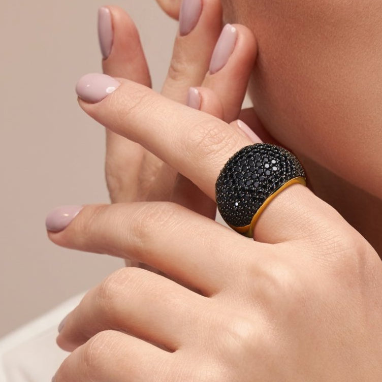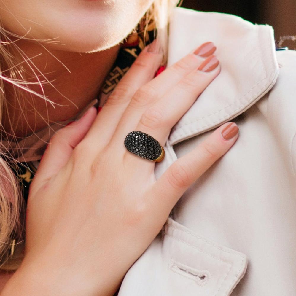 Dare to be different with the Unique 5.20 Ct Round-cut Black Spinel Ring by Black Diamonds New York. Crafted from 925 Sterling Silver and dipped 5x in yellow gold, this one-of-a-kind ring features a natural black spinel stone in an irregular shape that is full of gemstone allure. The round-cut design lends an elegant flair, while the stunning sparkly finish makes it a show-stopper. Embrace your individuality with this captivating and trendy piece that is as high-quality as it is affordable.