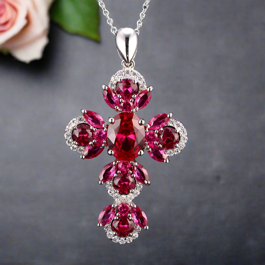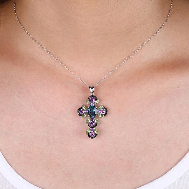 Embark on a style adventure with our Vintage Oval-cut Natural London Blue Topaz Cross Necklace! Crafted from 925 Sterling Silver and embellished with side stones of amethyst, black spinel, peridot, and created diamond, this necklace exudes a vintage charm that is both elegant and mystical. The sparkling blue topaz at the center adds a touch of whimsy to the double heart design, making it a truly captivating piece. Stand out from the crowd with this high-quality and affordable necklace that is as trendy as it is unique.