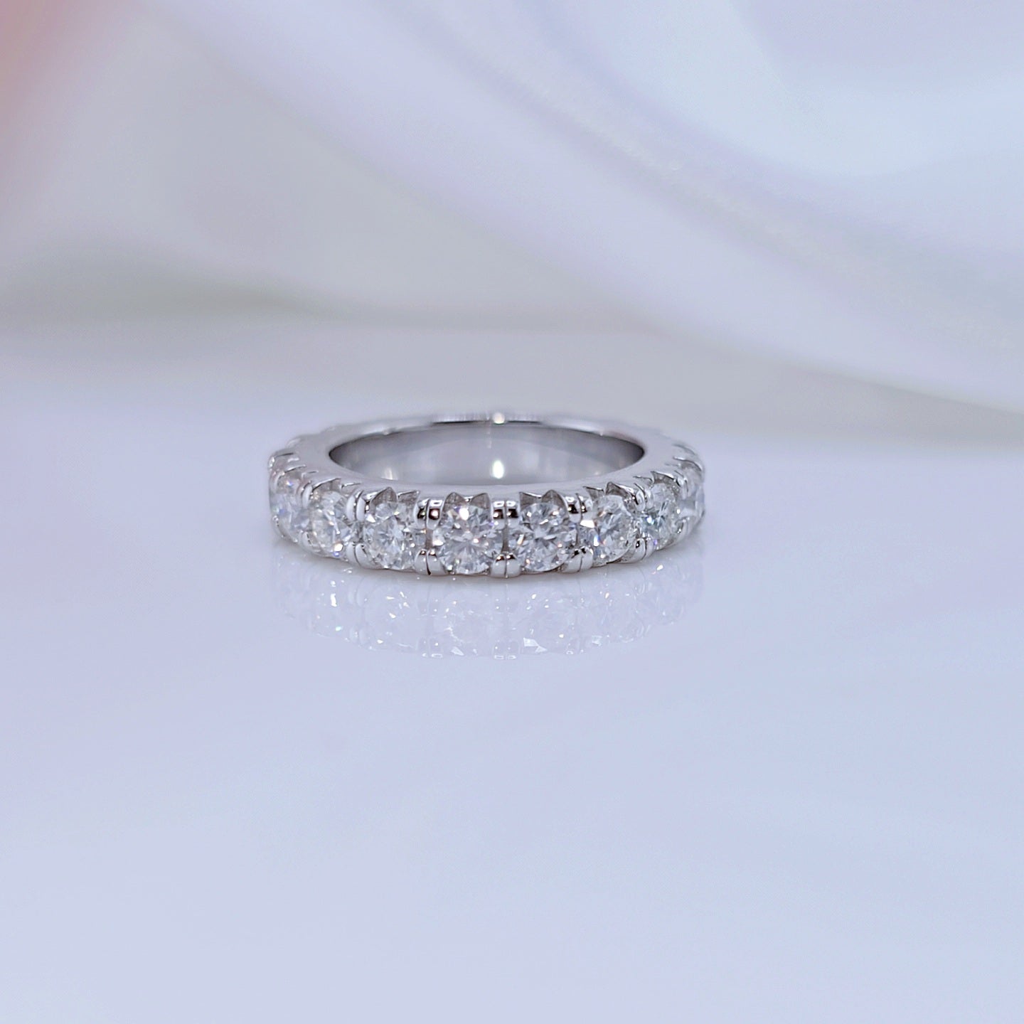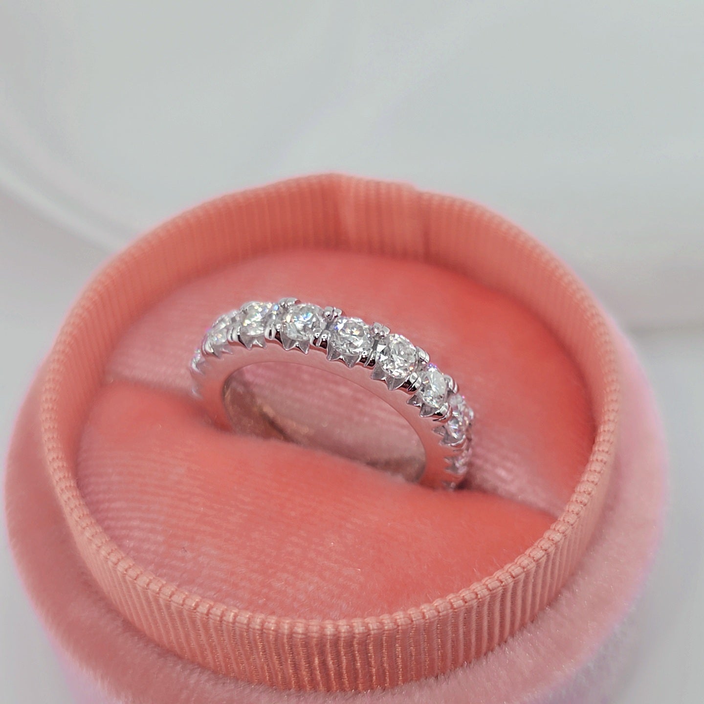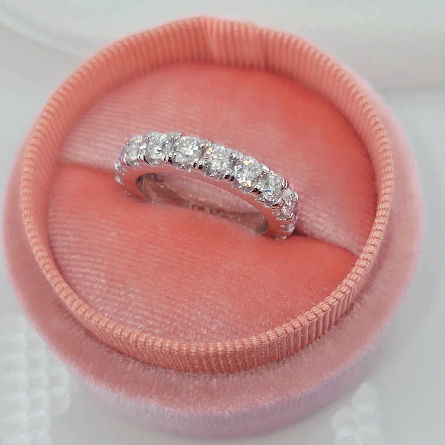 Unlock a new level of elegance on your special day with our Round Cut Certified Moissanite Eternity Wedding Band. Each stone is carefully selected and secured by a stylish prong design for a stunning display that sparkles from every angle. The shiny finish of this ring will make sure you shine as bright as your love for years to come.