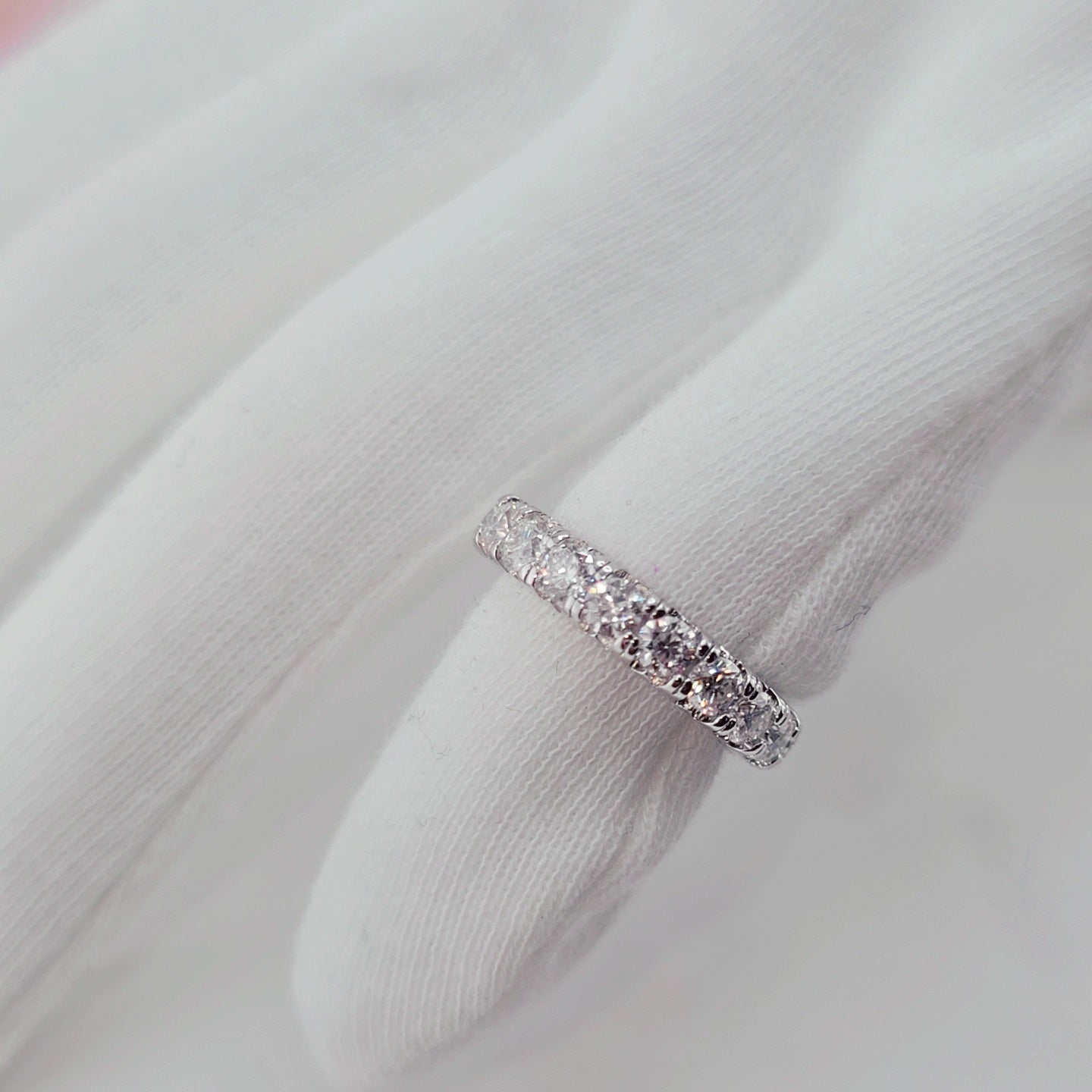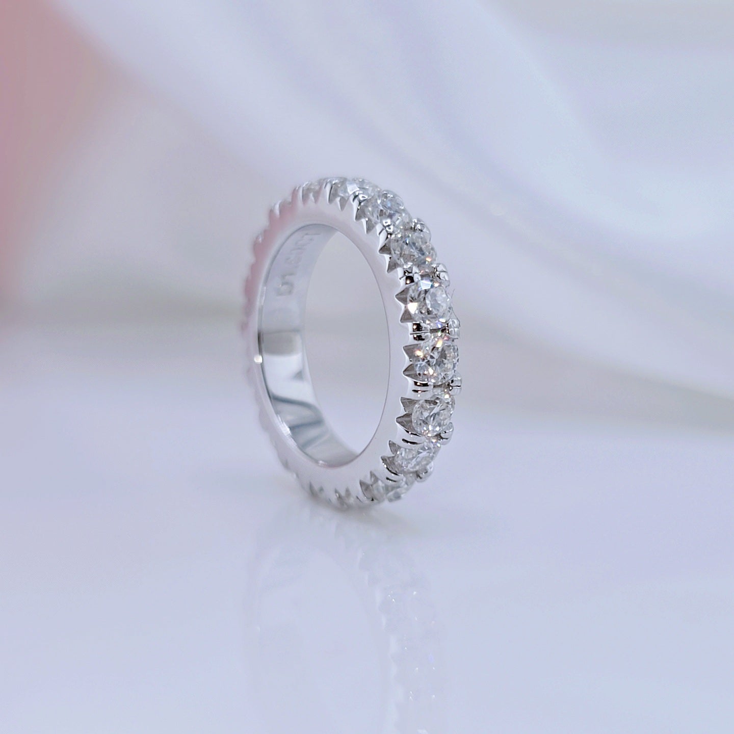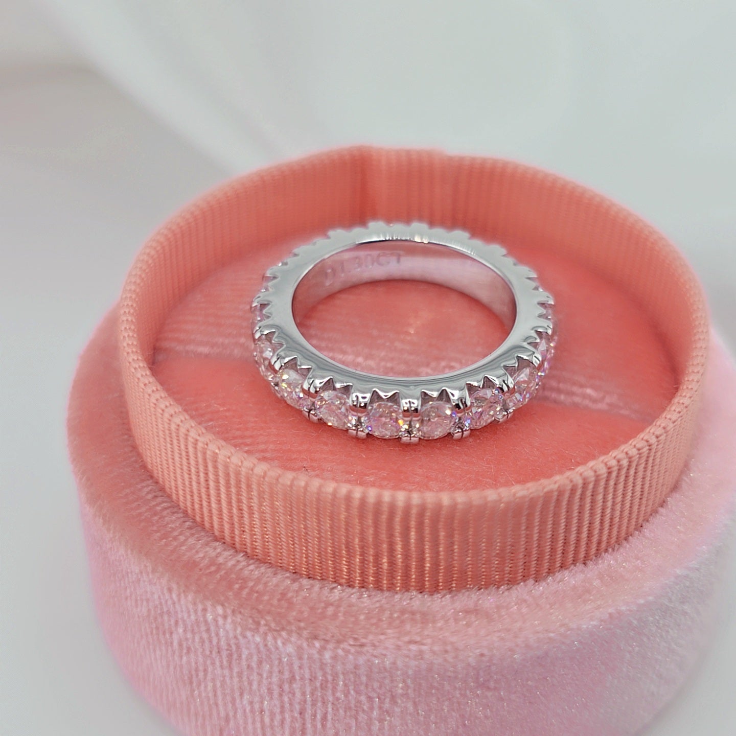 Unlock a new level of elegance on your special day with our Round Cut Certified Moissanite Eternity Wedding Band. Each stone is carefully selected and secured by a stylish prong design for a stunning display that sparkles from every angle. The shiny finish of this ring will make sure you shine as bright as your love for years to come.