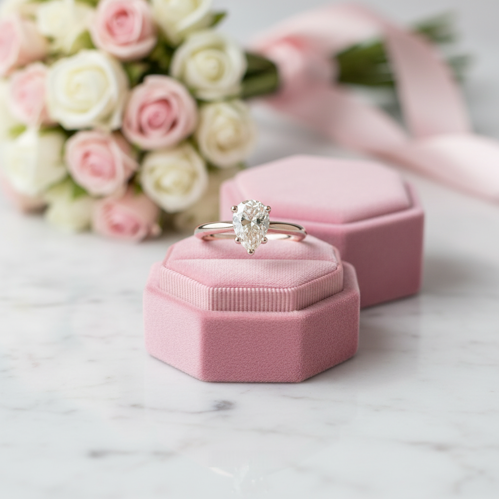 Rose gold ring and diamond ring on a pink velvet box with blurred flowers in the background