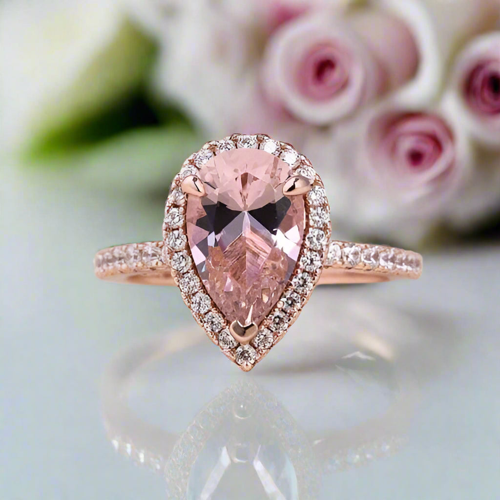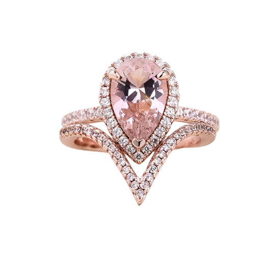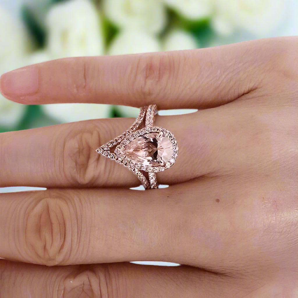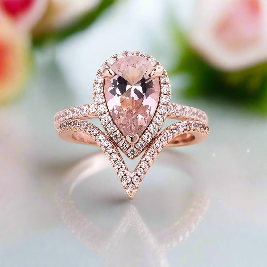 Rose Gold Halo Pear Cut Synthetic Morganite Wedding Set