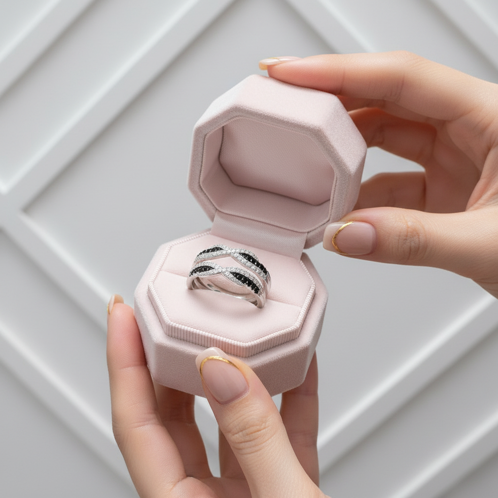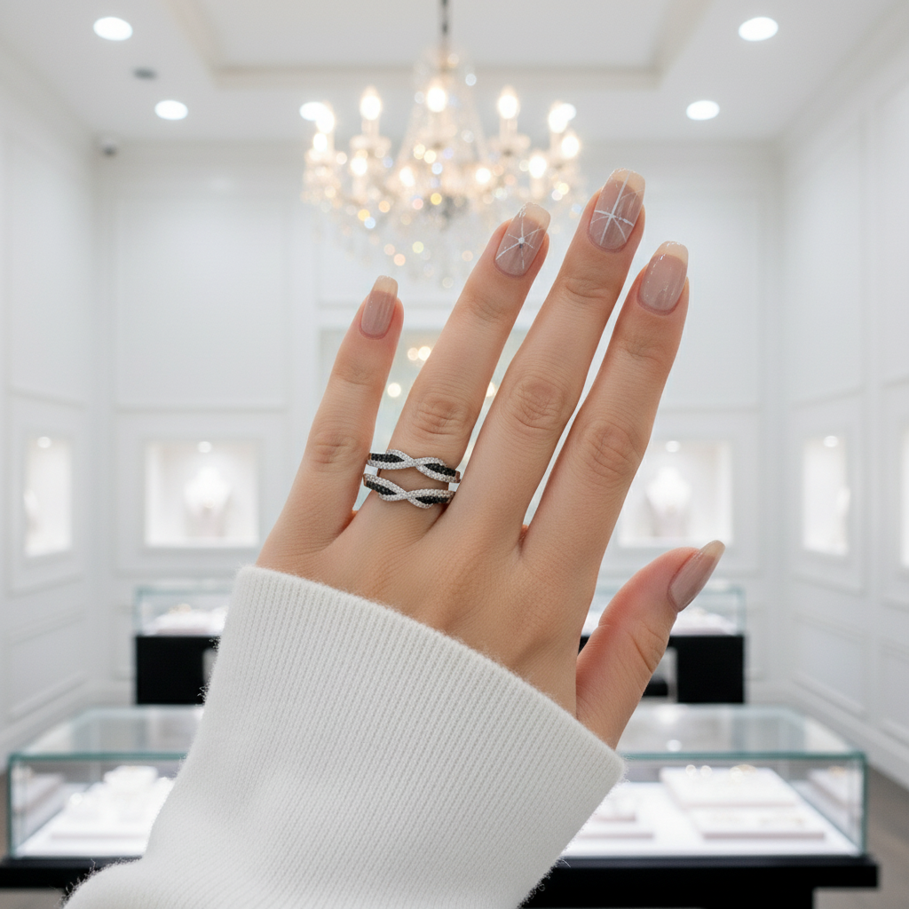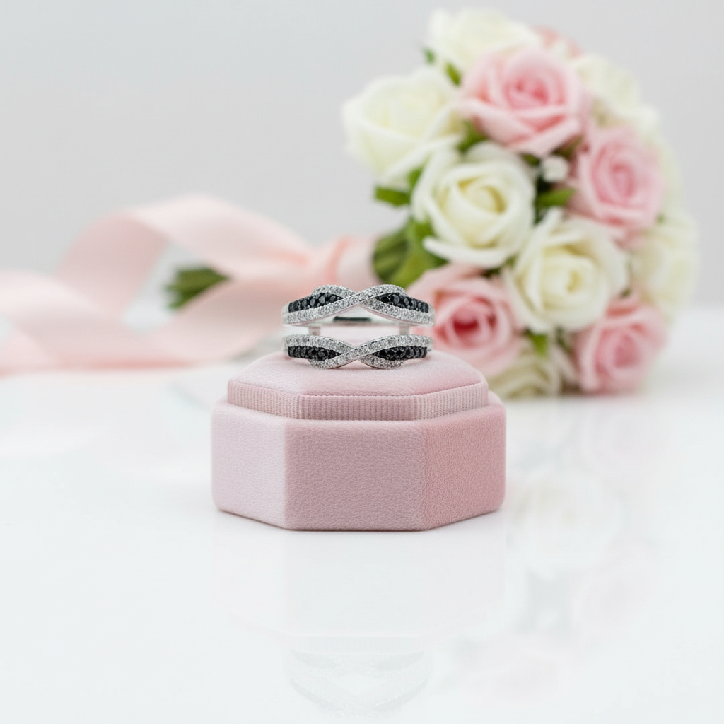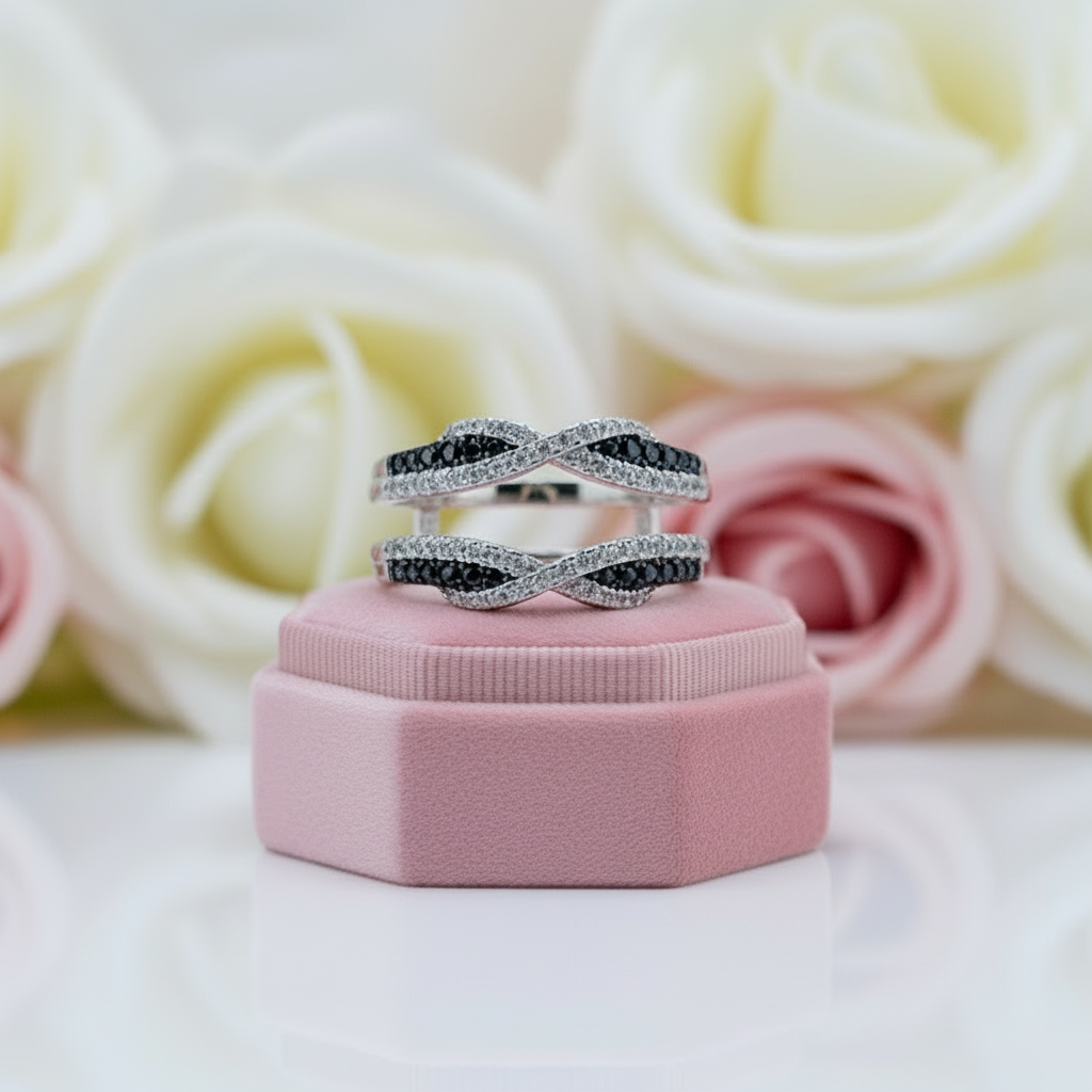 Indulge in the allure of our Diamond Alternative Twist Design Ring Enhancer! Featuring a mesmerizing round cut, clear and black Diamond Alternative , this ring enhancer is the epitome of elegance and sophistication. The sleek silver band beautifully frames the stone, while the intricate twist design adds a touch of modernity to the classic silhouette. Whether you're looking to impress on a date night or want to elevate your office attire, this ring enhancer effortlessly exudes both style and grace. Don't miss out on this perfect blend of timeless beauty and contemporary design!