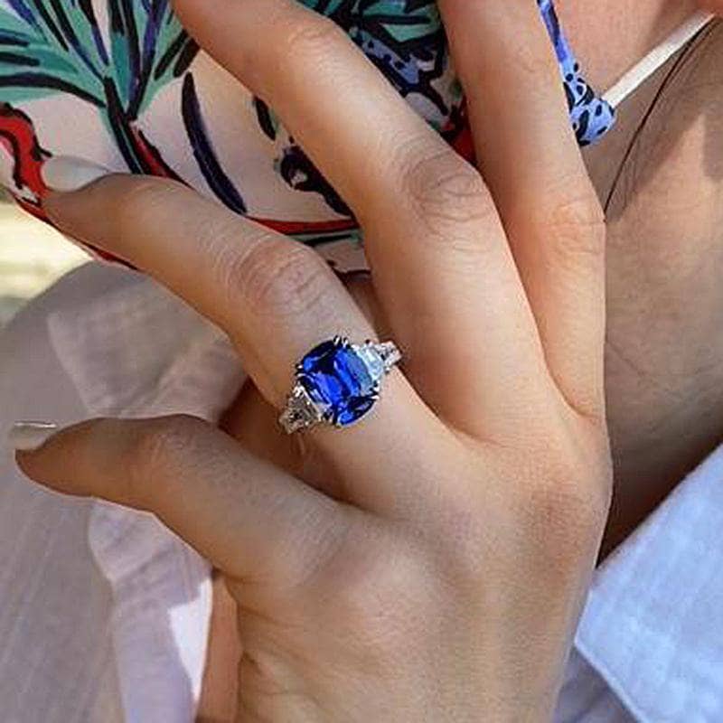 Split Shank Blue Sapphire Cushion Cut Three Stone Engagement Ring