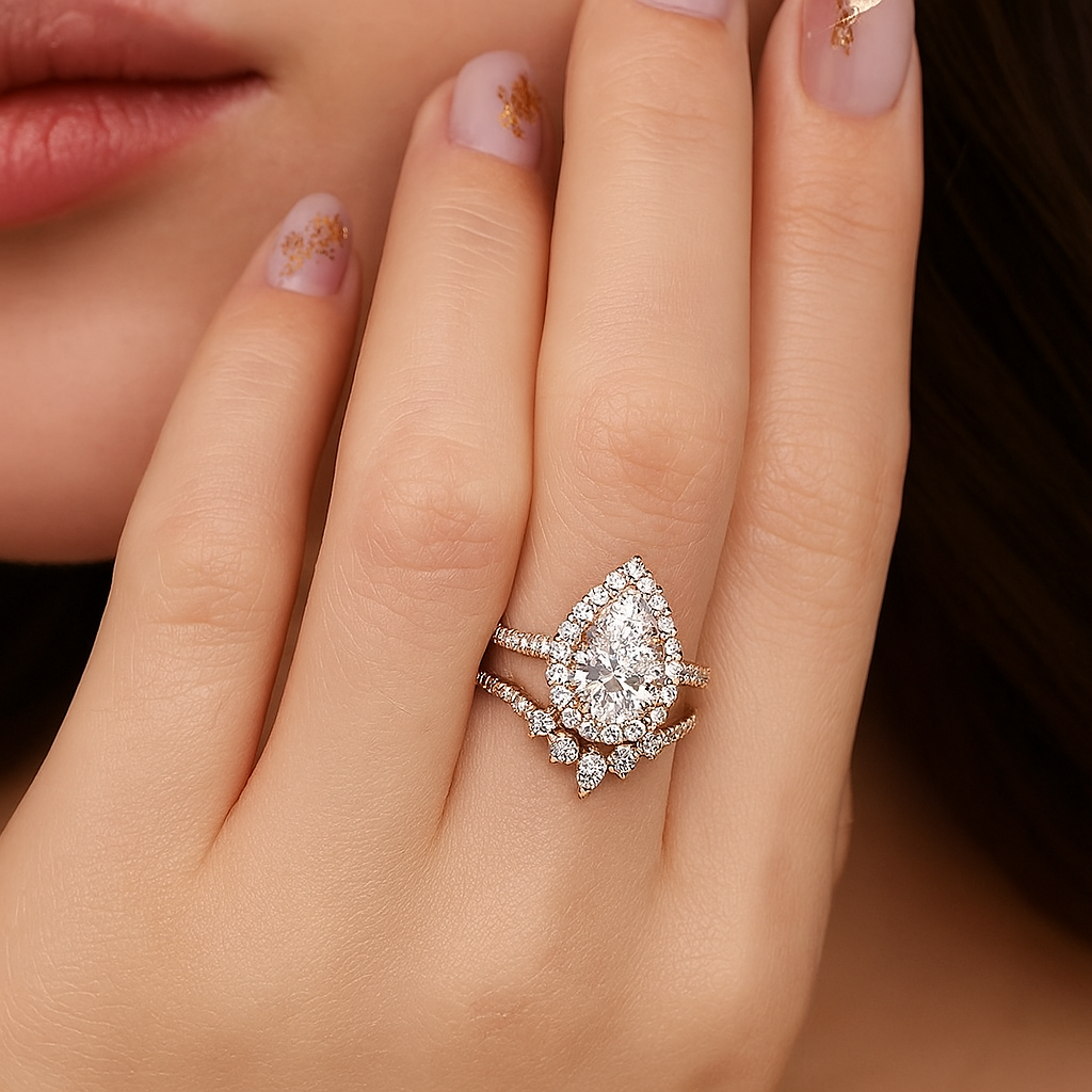 Elegant Rose Gold 2.2 Carat Halo Pear Cut Bridal Ring Set