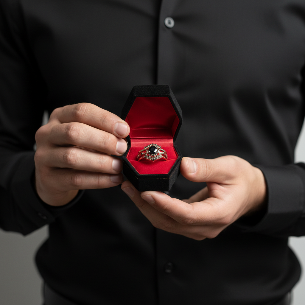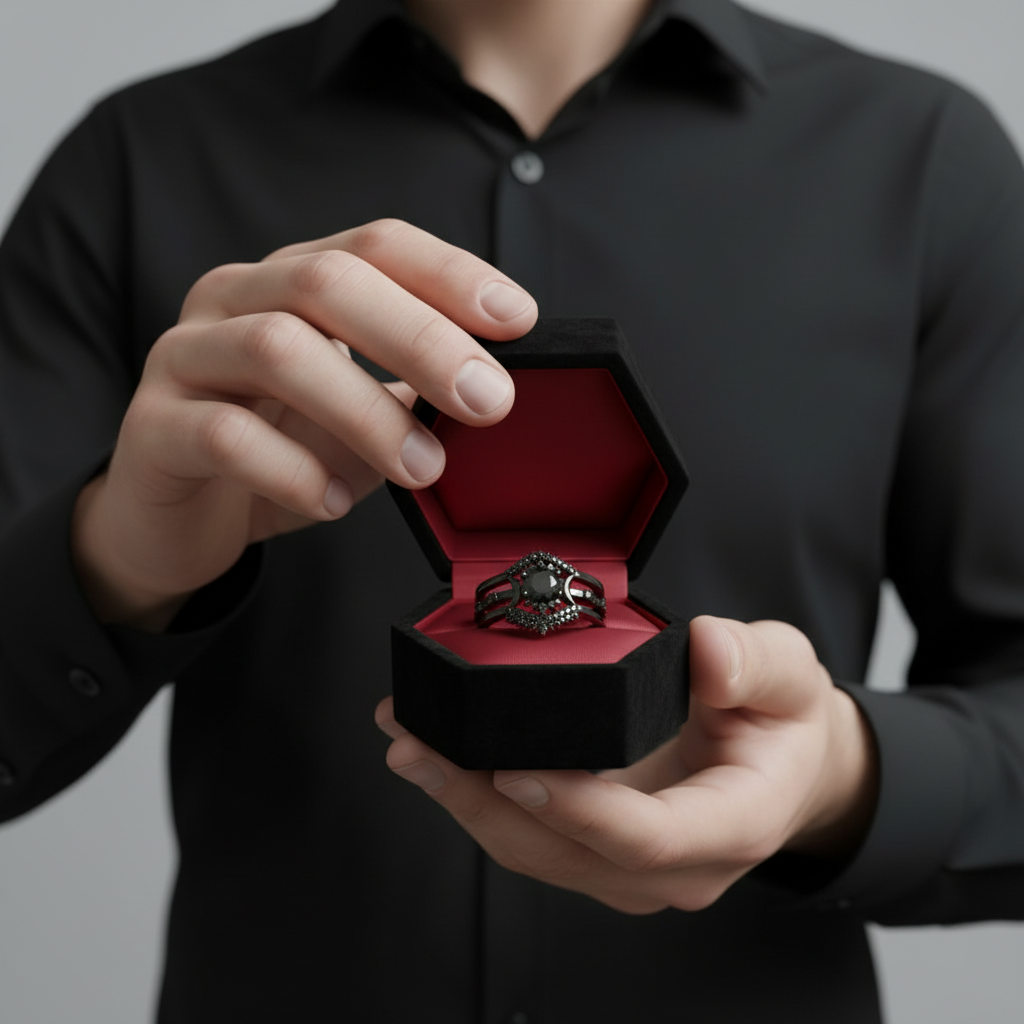 Inspired by the night sky, the Full Moon Engagement Ring symbolizes eternal love and celestial beauty. Handcrafted in 14K rose gold with a black stone alternative and sparkling white stones, it’s perfect for gothic brides, alternative weddings, and dark romance lovers a ring that shines as brightly as your love.