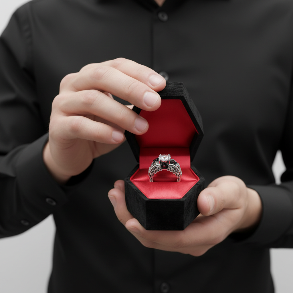 The I Want You Gothic Promise Ring features a breathtaking 1.5ct black stone surrounded by delicate red rose accents, symbolizing passion, mystery, and eternal devotion. Perfect for alternative brides and dark romance lovers, this gothic engagement ring blends elegance and edge, a statement of desire that never fades.