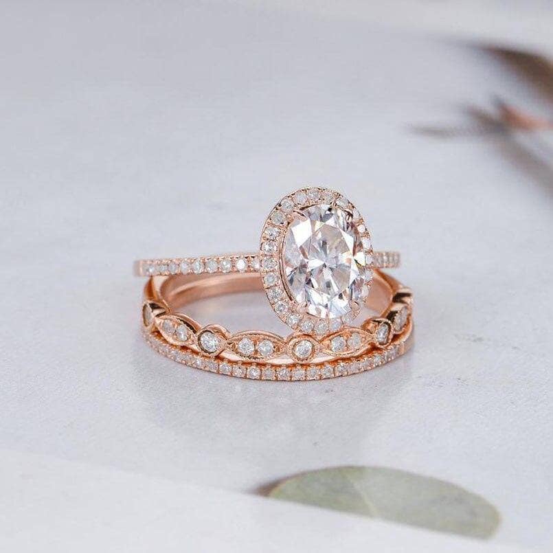 This 14k rose gold 1.5ct oval cut moissanite halo engagement ring set makes a truly remarkable statement. Expertly crafted for lasting quality and featuring a unique design, these rings are sure to impress. The oval cut diamond is securely showcased amid the polished settings, evoking a stunning radiance that epitomizes sophisticated elegance, all at an affordable cost.