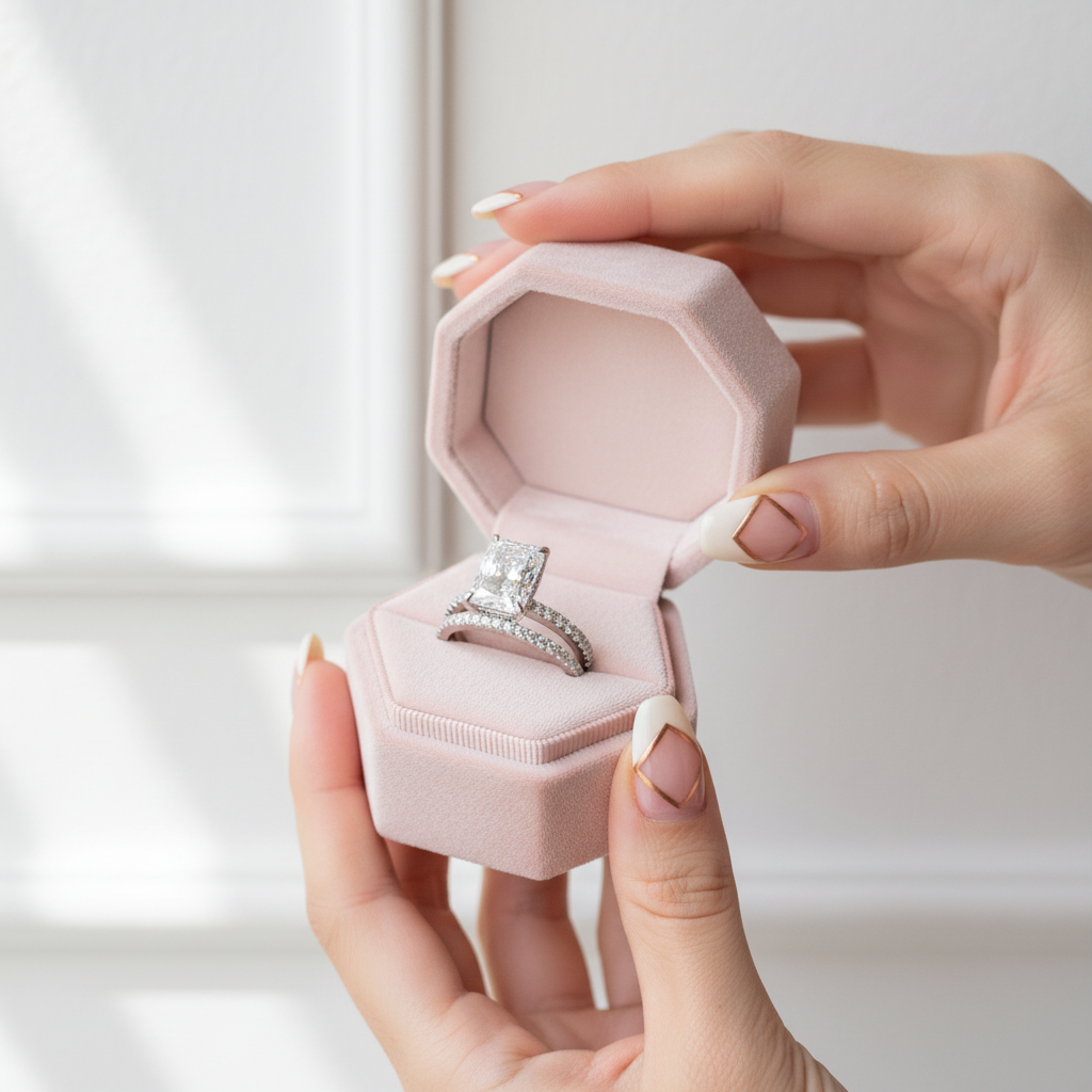Rose gold ring and diamond ring on a pink velvet box with blurred flowers in the background