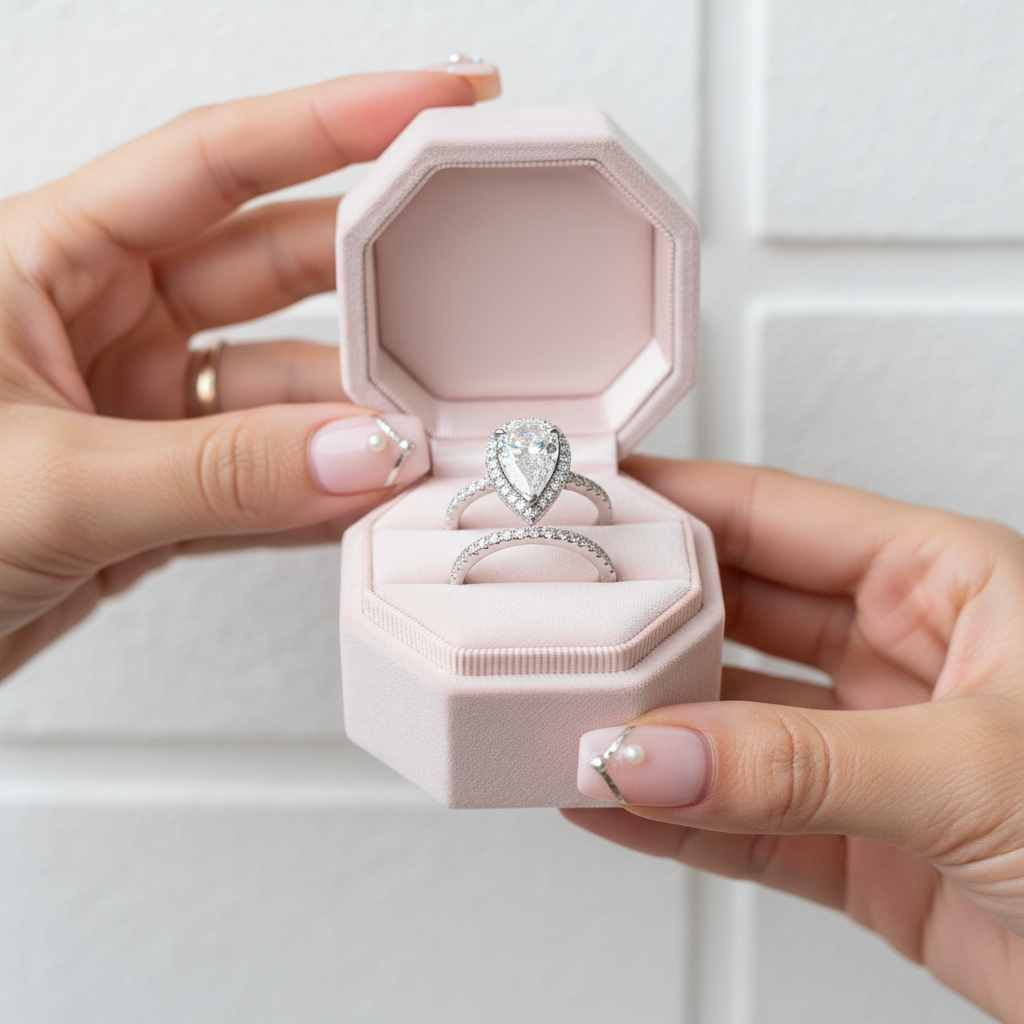 Rose gold ring and diamond ring on a pink velvet box with blurred flowers in the background