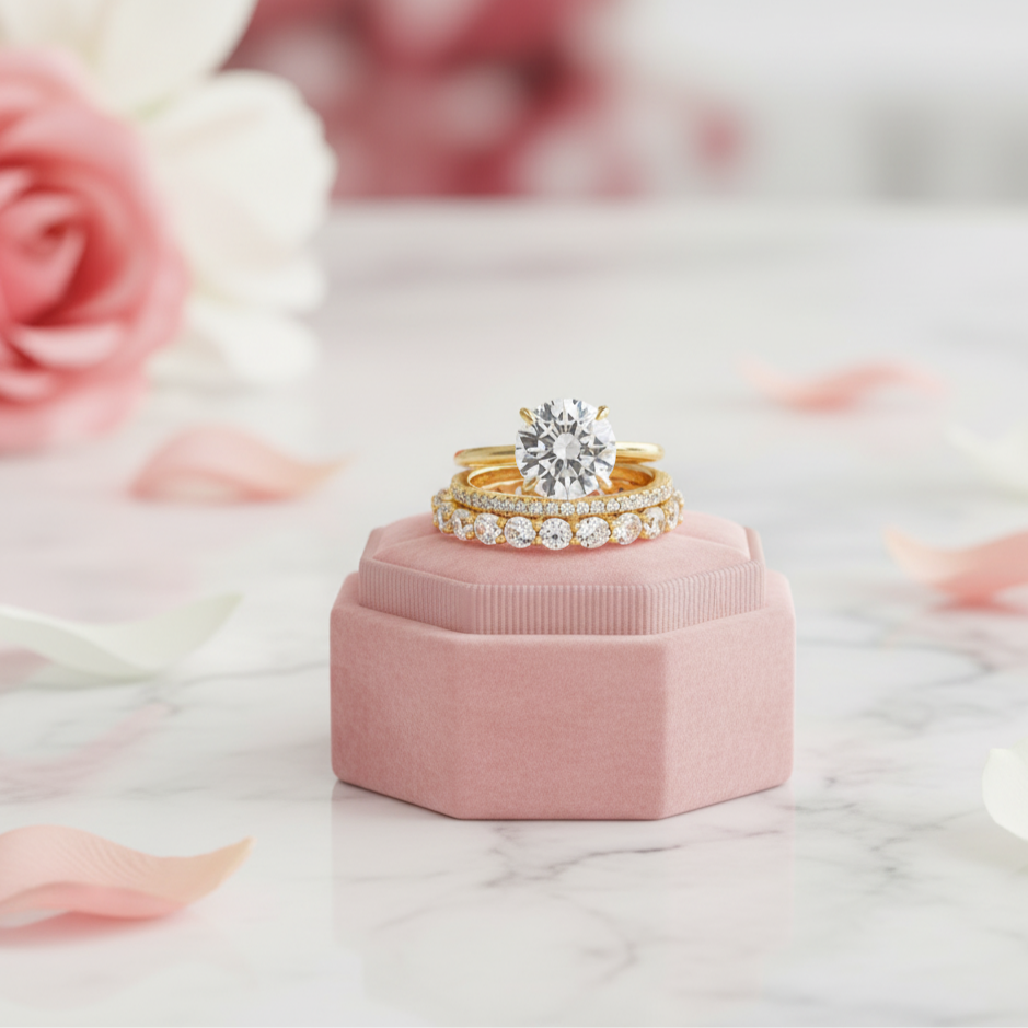 Rose gold ring and diamond ring on a pink velvet box with blurred flowers in the background