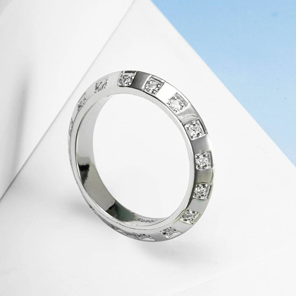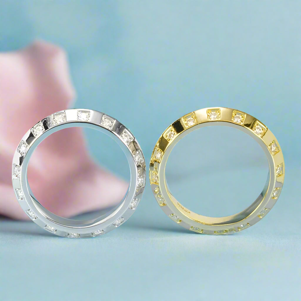 Add some extra sparkle to your special day with our 1.8mm Round Certified Moissanite Eternity Wedding Band. The round cut moissanite stones on this gorgeous band shimmer with a stunning brilliance that will catch everyone's eye. Crafted with care from 925 silver dipped 5x in 18k white gold, this ring is both high quality and affordable.