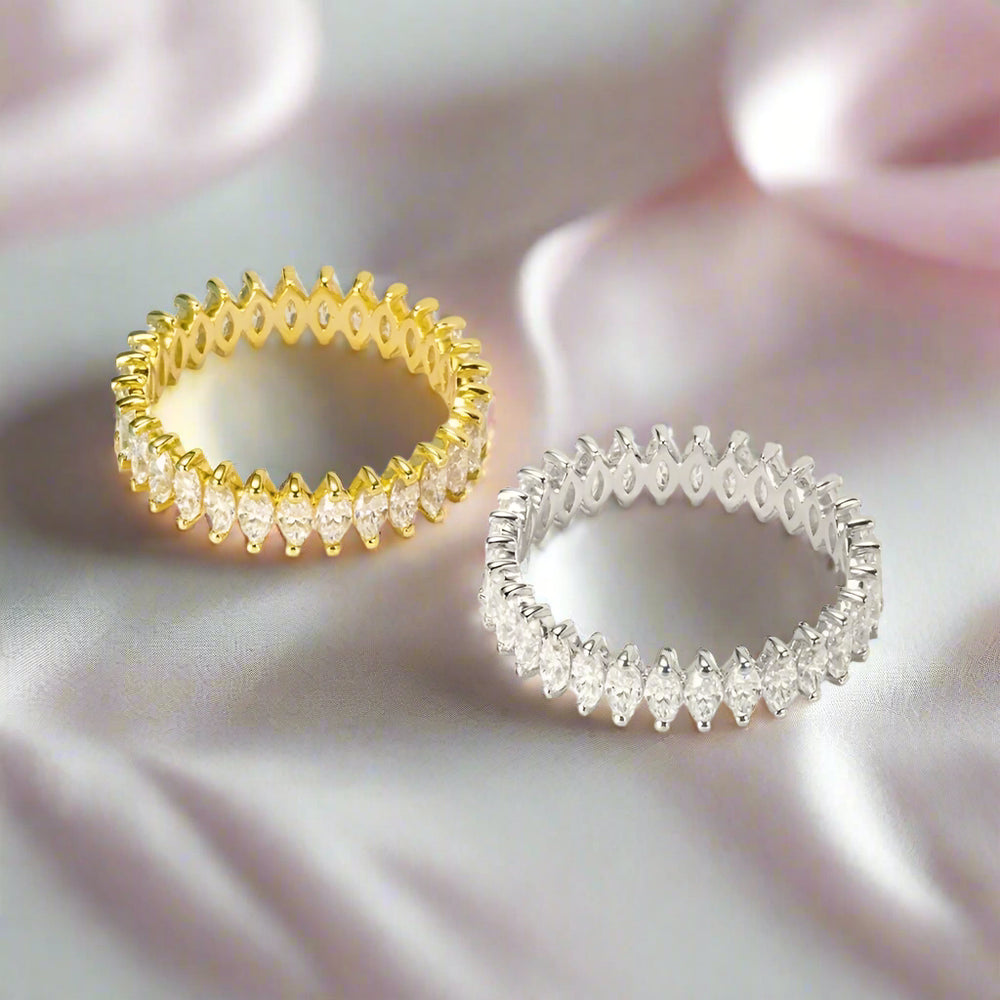 Create a lasting impression with the 3.0 Ctw Marquise Cut Certified Moissanite Wedding Band by Black Diamonds New York. This beautiful band features a breathtaking 3 carat total of marquise cut moissanite stones, set in lustrous 925 silver dipped 5x in 18k gold. Its stunning design, high quality craftsmanship, and affordable price make it a must-have for any bride-to-be. Shine bright with this sparkly and elegant ring on your finger.