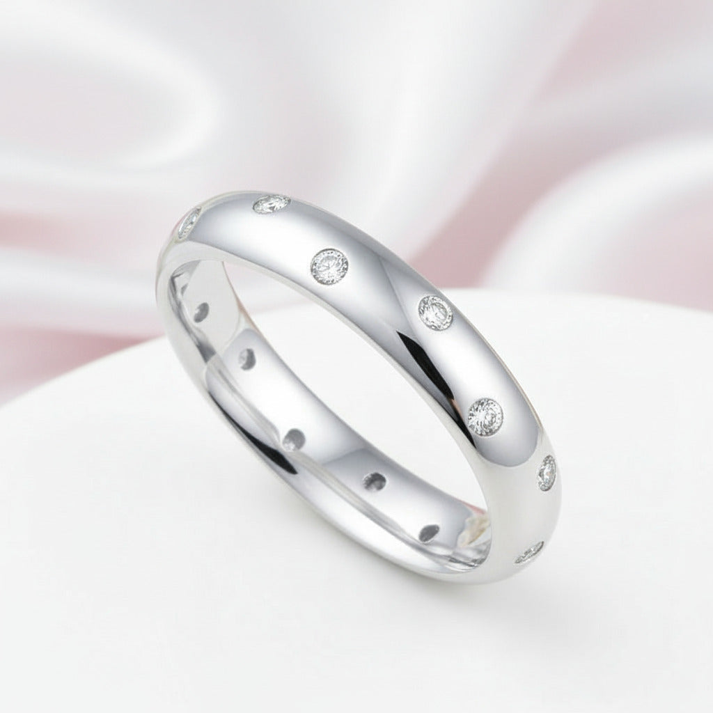 Indulge in the luxury of our Bezel-Set Diamond Wedding Band. Crafted with precision and attention to detail, this stunning 925 Sterling Silver ring boasts a 4 mm width and features a sparkling 1.5 mm round cut stone in a clear white color. The intricate pave setting adds a touch of elegance to this already exquisite piece, while the highly polished finish exudes sophistication. Rest assured, our materials are nickel and lead-free, so you can enjoy your ring without worry. Elevate your style with this exclusive piece, perfect for any occasion.