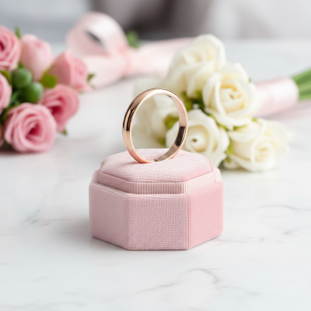 Classic 14k rose gold wedding band with a delicate 2.5mm width. Timeless design crafted to last, perfect for everyday wear and pairing with engagement rings.