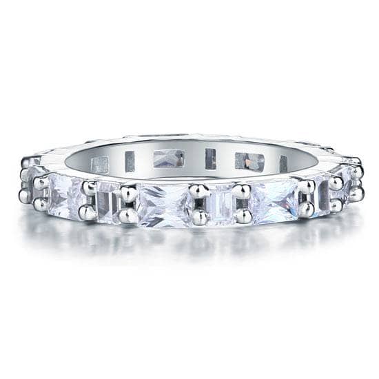 This exquisite wedding band features a gorgeous emerald and square cut clear white created diamond set in a 3mm wide 925 sterling silver band. The stones are prong set and plated with rhodium for added shine and durability.