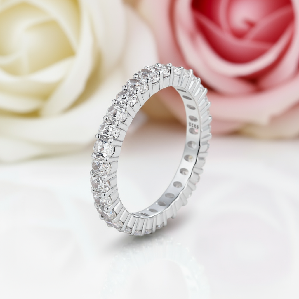 Handcrafted eternity oval cut simulated diamond ring that sparkles like natural diamonds at a fraction of the cost. Each stone is precision-cut and polished using professional diamond techniques for maximum brilliance. Perfect for engagements, weddings, anniversaries, or any special occasion. Durable and comfortable for everyday wear. Backed by a one-year warranty and 30-day guarantee.